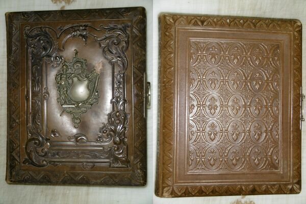 Portafotografie antico in pelle sbalzata a motivi floreali, cartiglio e chiusura in ottone