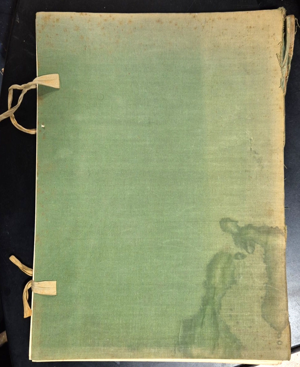 Copertina-contenitore in tutta tela con titoli dorati al dorso e al piatto entro elegante cornice e nastri per chiudere al taglio destro.