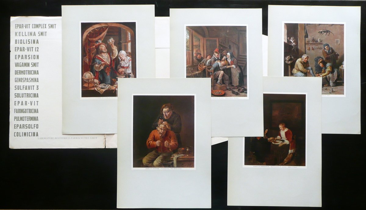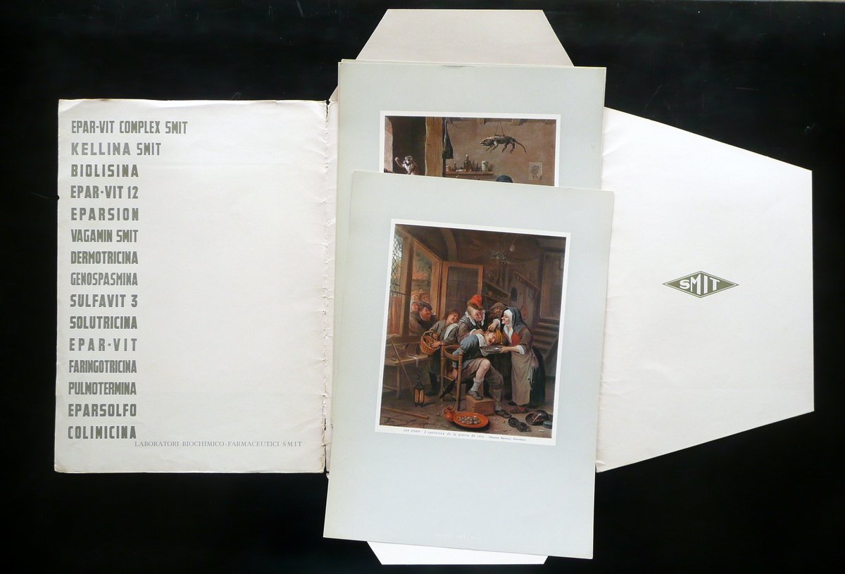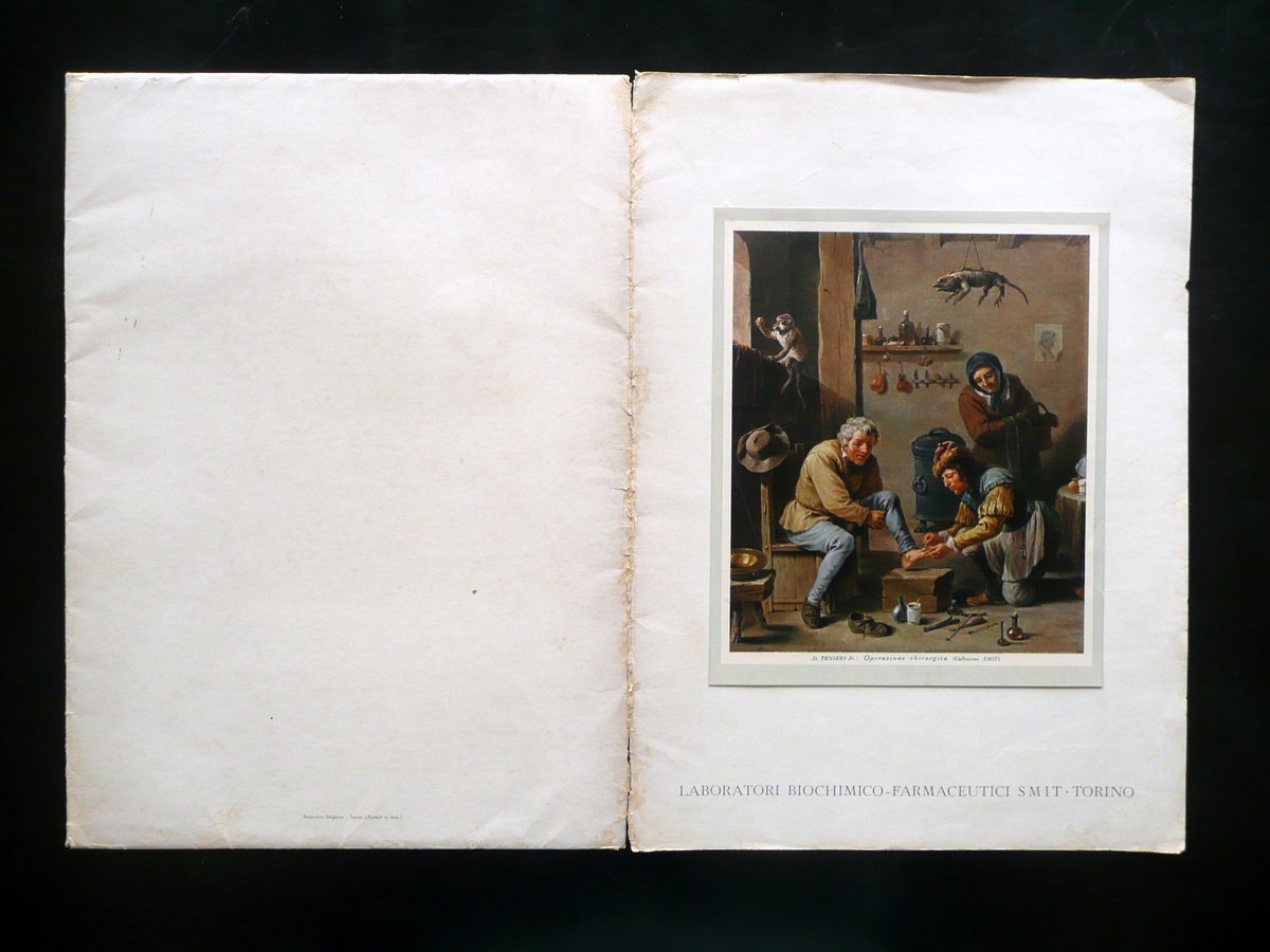 Portfolio, Laboratori Biochimico - Farmaceutici SMIT Torino Portfolio contenente cinque stampe a colori, tutte con riprodotta un'opera d'arte di soggetto medico - chirurgico Rotocalco Dagnino - SMIT, Torino, s. d. (anni '60 del Novecento circa); portfolio - cartella contenente cinque belle stampe a colori (vedi foto); copertina con una ill. a colori applicata. Cm 34x24,5 (portfolio); cm 33,5x24 (stampe a colori). Condizioni di conservazione Portfolio - cartella complessivamente ben conservato con alcune piccole leggere abrasioni e difetti ai margini, agli angoli e al dorso; cuffie entrambe con uno strappetto di qualche cm. Stampe a colori tutte molto ben conservate con minime tracce di utilizzo; solamente margine inf. di una stampa con un pressoché trascurabile strappetto. SC03.D10696 N