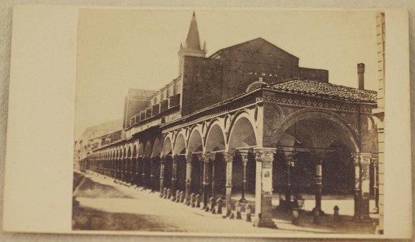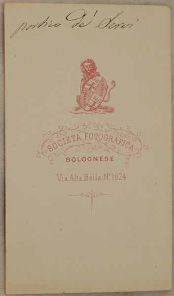Foto originale all'albumina del 1865 circa che mostra il portico de servi di Bologna.<BR>Al verso "Societa fotografica bolognese" studio fotografico attivi in via Alta bella n. 1624 (oggi n. 9) dal 1862 al 1866. La fotografia è applicata su cartoncino originale marchiato. Antica nota manoscritta che indica "Portico de servi". Dimensioni cartoncino: mm 105x61.<BR>Dimensioni foto: mm 81x60. In ottime condizioni. Original albumine photo of 1865 circa showing the view of portico de servi in Bologna. In the verso "Societa fotografica bolognese" photographers active in via Alta bella n. 1624 (today n. 9) from 1862 to 1866. The photo has been applied in an original marked carton paper.<BR>Ancient handwritten note indicating "Portico de servi". <BR>Size of page: mm 105x61. Size of the photo: mm 81x60. In very good conditions.