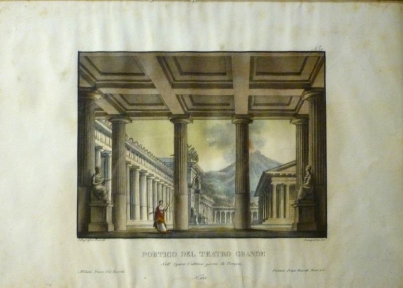 Litografia originale, colorata a mana, tratta da 'Nuova raccolta di scene teatrali inventate dal celebre Sanquirico e pubblicate da Giovanni Ricordi'; foglio di cm 25 x 35 circa - immagine cm 16 x 21 circa. Leggero aloncino al margine bianco inferiore; per il resto in ottimo stato di conservazione. Rara e decorativa. L'opera 'L'Ultimo giorno di Pompei', di Giovanni Pacini, debuttò a Napoli nel 1825, per essere rappresentata alla Scala nella stagione del 1827. Alessandro SANQUIRICO (Milano, 1777 – 1849) è stato scenografo, architetto, pittore, disegnatore e calcografo italiano. Allievo di Giovanni Perego. Come architetto collaborò a realizzare il Teatro alla Scala di Milano, il Teatro Alberti di Desenzano, il Teatro Sociale di Canzo, il Teatro Sociale di Como e il Teatro Municipale di Piacenza. Realizzò con Andrea Appiani e il Bargigli l'Arena di Milano. Divenne lo scenografo più importante della sua epoca, e scenografo unico del Teatro alla Scala dalla metà degli Anni '20. Nel 1830 riesce a mandare in scena contemporaneamente due opere destinate a rimanere nella storia: I Capuleti e i Montecchi di Bellini alla Scala, e Anna Bolena di Donizetti in prima assoluta al teatro Carcano. Velocissimo nel disegnare e realizzare apparati in pochi giorni, Sanquirico affronta le commissioni in modo realistico e positivo. A lui si deve anche il rifacimento nel 1830 del decoro degli interni della Scala. In anticipo sui tempi, sfrutta il valore commerciale delle sue opere realizzando grandi album che dona a illustri personaggi e personalità (da Giuditta Pasta all’Imperatore, da Carlo Alberto a Isabella di Borbone) con il doppio risultato di svolgere attività promozionale e di lasciare una amplissima documentazione per i posteri. Tra i suoi ammiratori c’è anche Stendhal, che racconta di non aver mai visto gli eterni problemi della finzione teatrale – una tempesta, un incendio, l’eruzione di un vulcano – risolti con tecniche così ardite. Come pittore collaborò alla decorazione del Duomo di Milano, dipingendone le volte simulanti un traforo gotico. Celebri anche le vedute cittadine di del capoluogo lombardo.
