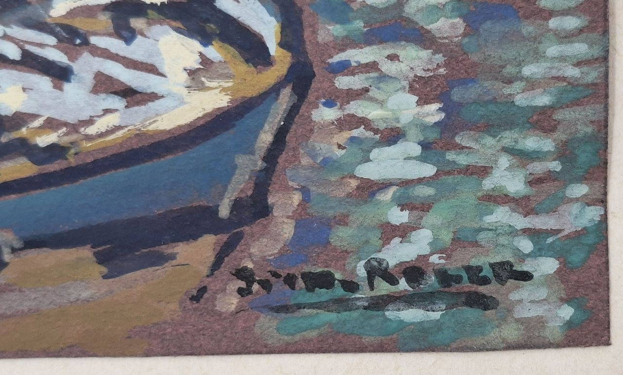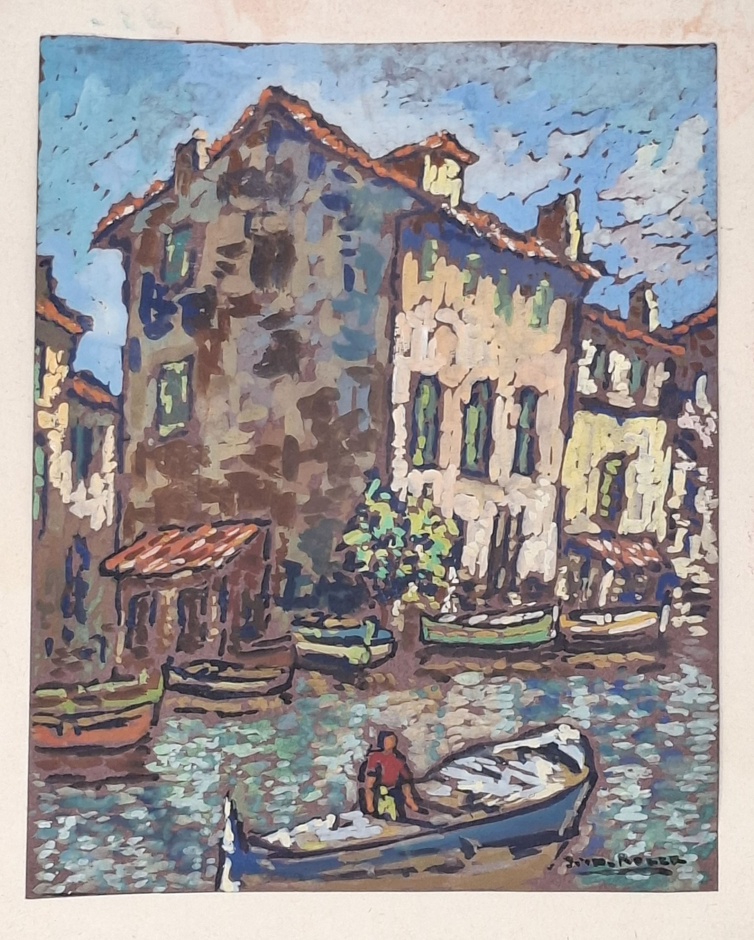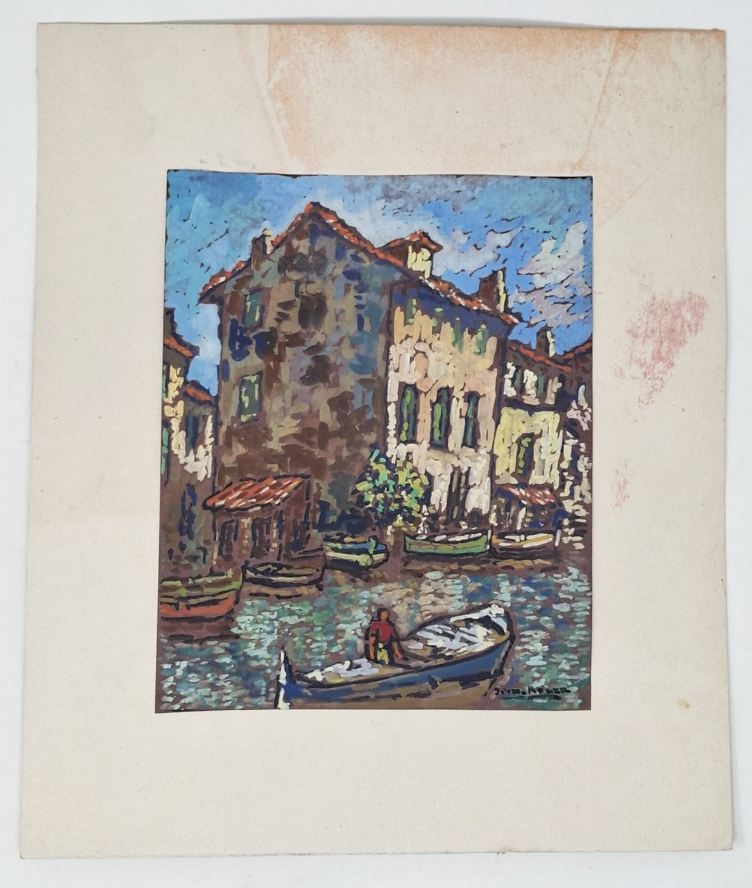 Dipinto, applicato su cartoncino, realizzato con tecnica mista, firmato in basso a destra 'Jean - Roger' e titolato, a matita sul retro del supporto. Il titolo è illeggibile ma sicuramente il soggetto è un piccolo porto. Jean Roger è stato un artista francese, nato nel 1924 e morto nel 2015. Le sue opere sono state più volte vendute in asta. Dimensioni del dipinto: 13,6 x 17 cm circa. Dimensioni del cartoncino utilizzato come supporto: 22 x 26 cm circa. Stato di conservazione: dipinto decisamente ben conservato. il cartoncino presenta diverse macchie di colore. Paesaggio realizzato con la tecnica molto personale di Roger.