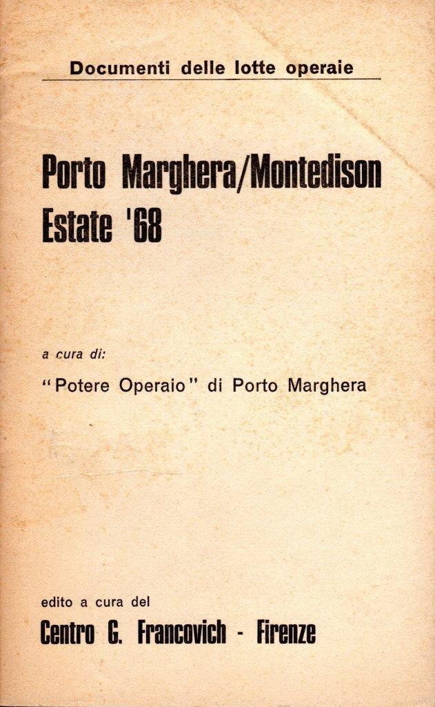 Porto Marghera / Montedison / Estate '68, prima edizione ottobre 1968, pp. 47, formato 11 x 18. <BR>Copertina morbida di colore beige con titoli in nero al piatto anteriore. Documenti delle lotte operaie. <BR>Leggere bruniture ai piatti. Nel complesso condizioni molto buone.