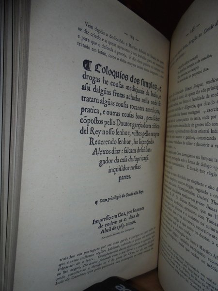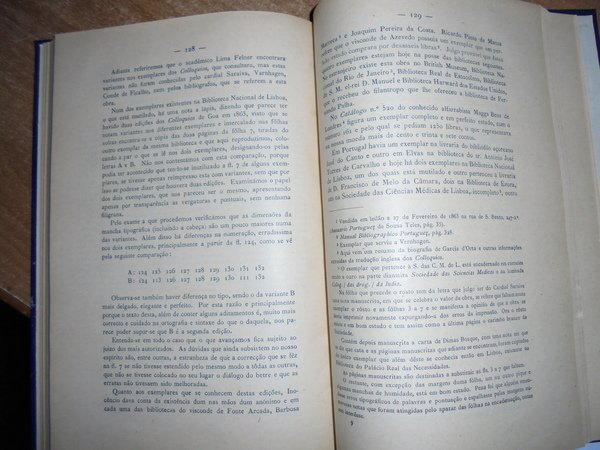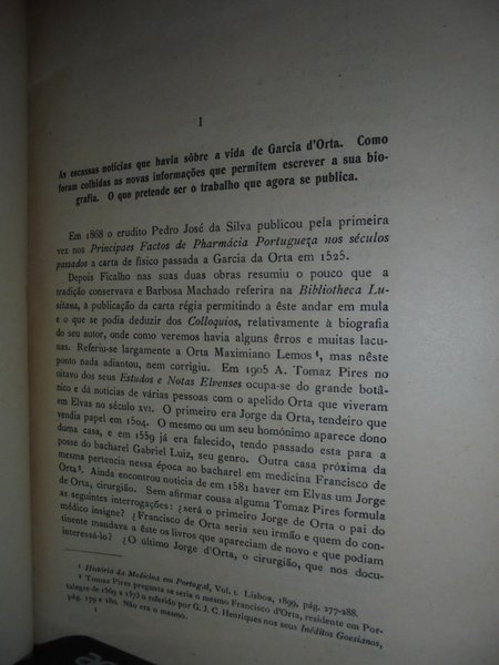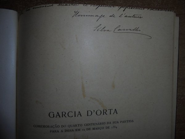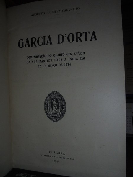 Augusto Da Silva Carvalho. Coimbra, Imprensa da Universidade, 1934. GARCIA D' ORTA. Comemoraçao do quarto centenàrio da sua partida para a India em 12 de Março de 1534. In-8°, m. tela con titolo in oro al dorso. (iv), 208, (1) pp. con alcune illustrazioni n.t. (estratto). Firmato dall' Autore all' occhietto. Garcia de Orta è stato un botanico portoghese. Medico in India, nel 1543 descrisse, primo tra gli occidentali, il colera; nel 1548 introdusse in Europa la coltivazione del limone. Nel 1563 pubblicò i suoi Coloquios dos simples e drogas he cousas mediçinais da India, tradotta poi in latino da Carolus Clusius nel 1567. Neg. mob. 2 teatr.