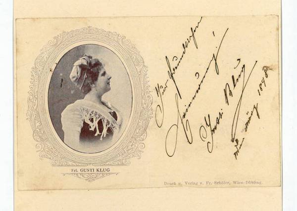 ½ S. Qu.-8vo. Einem namentlich nicht genannten Adressaten "zur freundlichen Erinnerung". Die Karte zeigt ein Brustbild der Schauspielerin im Profil. - Auguste Klug trat am Theater an der Wien, am Carltheater und später am Theater in der Josefstadt auf. Nach mehrjährigem Aufenthalt in Preßburg und Dresden war sie wieder am Theater in der Josefstadt zu sehen. Vgl. Eisenberg, Das geistige Wien, s. v.