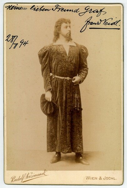 164:110 mm. Ganzfigürliche Darstellung des Sängers im Rollenkostüm aus dem Atelier Rudolf Krziwanek, Wien & Ischl, mit dessen gedr. Signet am unteren Rand des Trägerkartons. Die Bildseite mit eh. Widmung "meinem lieben Freund Graf [.]". - Franz Neidl debütierte 1885 am Reichenberger Stadttheater, ging 1886 nach Königsberg und 1887 an das Stadttheater Köln. Von 1888 bis 1890 war er - als Bariton und Baßbariton besonders in Wagneropern erfolgreich - am Hoftheater Mannheim, anschließend an der Wiener Hofoper engagiert, von wo er 1904 nach schwerer Krankheit Abschied nahm. - Leicht ausgebleicht.
