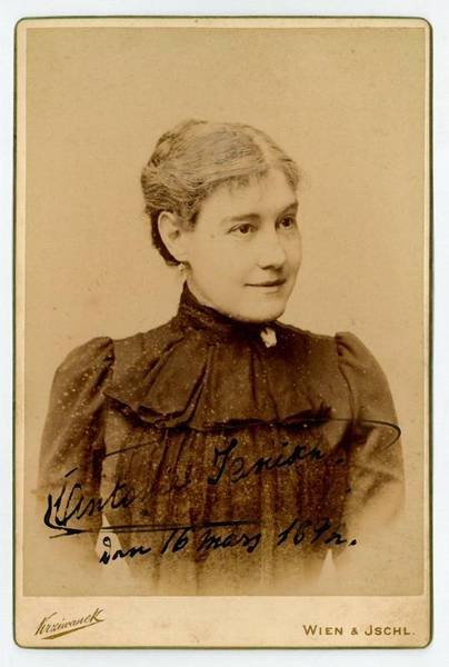 165:110 mm. Bruststück der Schauspielerin im Halbprofil aus dem Atelier des Photographen Krziwanek, Wien, mit dessen gedr. Signet am unteren Rand des Trägerkartons. Die Unterschrift auf der Bildseite und Widmung "Mit freundlichem Gruß" auf der Verso-Seite. - Janisch debütierte 1863 am Theater an der Wien, gastierte 1867 am Burgtheater und nahm 1868 erneut Schauspielunterricht in Berlin. 1869 trat sie erfolgreich am Thalia-Theater in Hamburg auf, 1872-73 am Wiener Burgtheater und unterbrach ihre Bühnentätigkeit nach ihrer Heirat mit Graf Arco 1873 für kurze Zeit. 1875-82 war sie wieder Ensemblemitglied des Burgtheaters, trat dann an deutschen, englischen und amerikanischen Bühnen auf und spielte von 1892 bis zu ihrem Abschied von der Bühne wieder am Wiener Burgtheater.