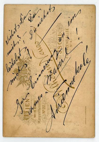 165:115 mm. Ganzfigürliche Darstellung der Schauspielerin aus dem Atelier des Photographen Wilhelm Neuss, Wien, mit dessen gedr. Signet am unteren Rand des Trägerkartons. Die Widmung auf der Verso-Seite: "Siehst du mich? - Du lächelst! Du siehst mich! Zur Erinnerung an ein armes ‚Waserl'!". - Kolá debütierte als Klärchen am Stadttheater in Leipzig, wirkte 1884-88 am Stadttheater in Wiesbaden und wurde anschließend an das Wiener Burgtheater verpflichtet, zu dessen Ensemble sie bis 1893 sowie 1904/05 gehörte. Später gab sie nur noch Gastspiele.