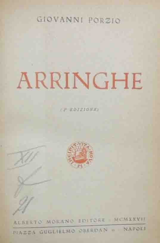 Giovanni Porzio, Arringhe, Alberto Morano Editore, Napoli 1927, seconda ed., pp. 284, cm 22, legatura in tela con titoli al dorso e tagli spruzzati in rosso. Tracce d’uso alla legatura con minime scoloriture e piccole abrasioni, leggera brunitura della carta, per il resto ben conservato.