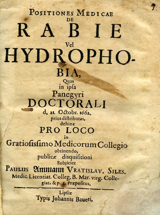 In-8°, pp. (25), brossura posteriore in marmorizzatura viola. Una testatina, un'iniziale e un cul-de-lampe ornati in xilografia. Bruniture sparse, un alone all'angolo inferiore destro del titolo. Dissertazione di dottorato in medicina tenuta a Lipsia il 21 ottobre 1662 in merito alla rabbia e all'idrofobia. L'Ammann (Breslau, 1634-Lipsia, 1691), medico, fisiologo e botanico, insegnò lungamente a Lipsia. Le sue principali opere sono: Medicina Critica (1670); Paraenesis ad Docentes occupata circa Institutionum Medicarum Emendationem (1673); Irenicum Numae Pompilii cum Hippocrate (1689); Supellex Botanica (1675); Character Naturalis Plantarum (1676).