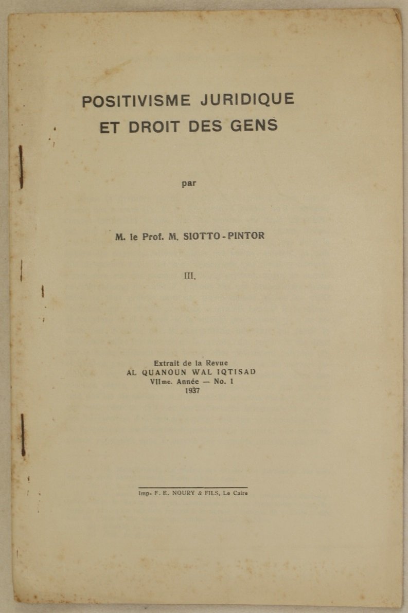 In 8. Dim. 24,5x16 cm. Pp. 28. Interessante pubblicazione del 1937 sul positivismo giuridico e diritto delle genti del Prof. M. Siotto-Pintor. Estratto dalla Revue al Quanoun Wal Iqtisad numero 1 del 1937. In buone condizioni. Copertina editoriale in buone condizioni generali con lievi usure ai margini e dorso. Legatura in ottime condizioni. All'interno le pagine si presentano in ottime condizioni con rare fioriture. Interesting pamphlet of 1937 about juridical positivism and people's right by Prof. M. Siotto-Pintor. Extract from Revue al Quanoun Wal Iqtisad number 1 of 1937. In good conditions. Editorial cover in good general conditions slightly worn in the edges and spine. Binding in very good conditions. Inside pages are in very good conditions with occasional foxings.<BR><BR>