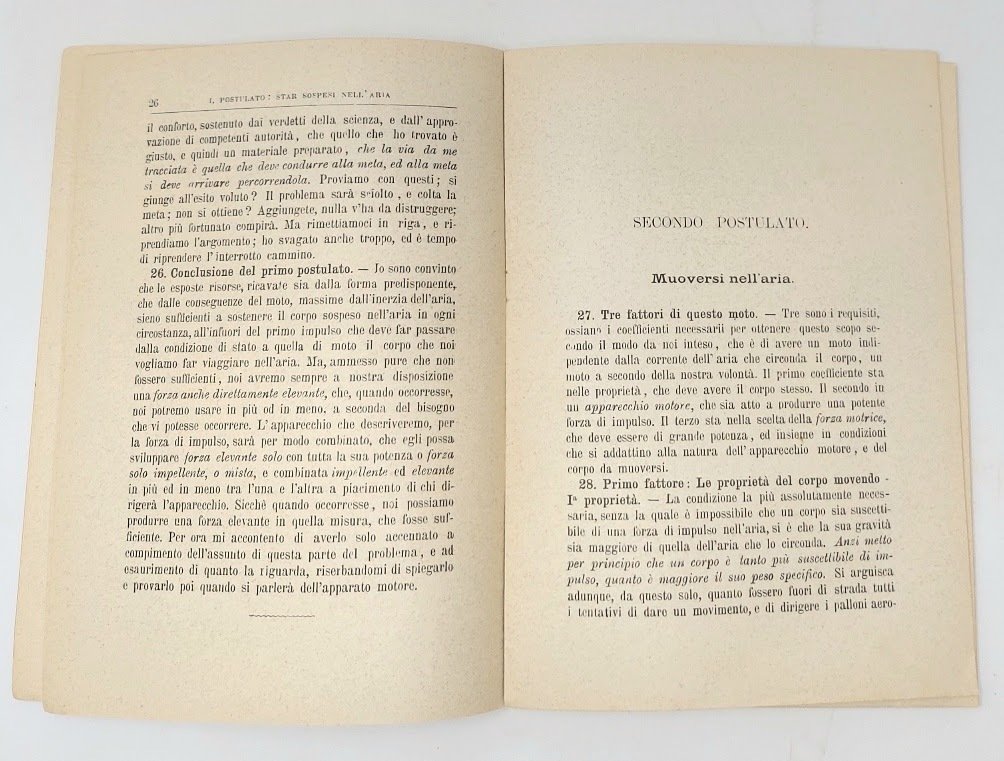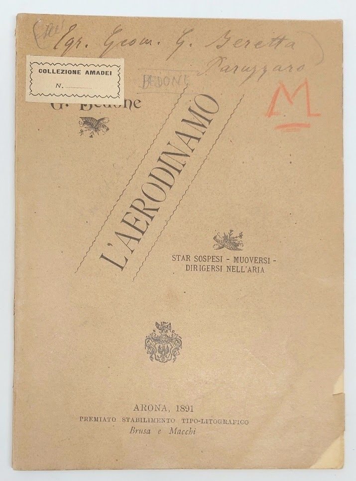 >in-16 (180X130 mm), pp. 71, (1), broch edit con note di possesso al piatto superiore e piccole mancanze all'angolo inferiore. L'abate Giacomo Bedone (1826-1904) di Meina nel novarese, fu studioso di navigazione aerea ed inventore di un velivolo denominato “aerodinamo”. L'opera è divisa in tre postulati: star sospesi nell'aria, muoversi nell'aria e dirigere il moto a volontà del dirigente. Non comune, edizione originale.
