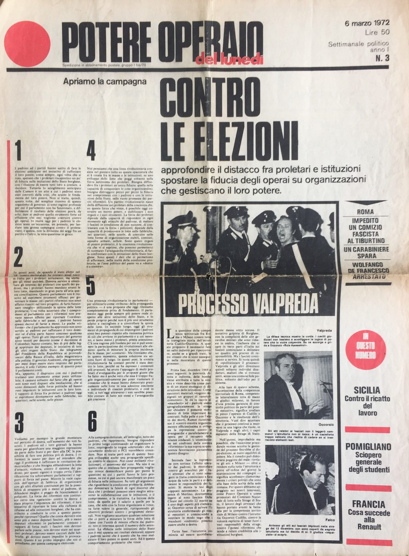 Potere Operaio del Lunedì. Anno I. No. 3. 6 Marzo 1972