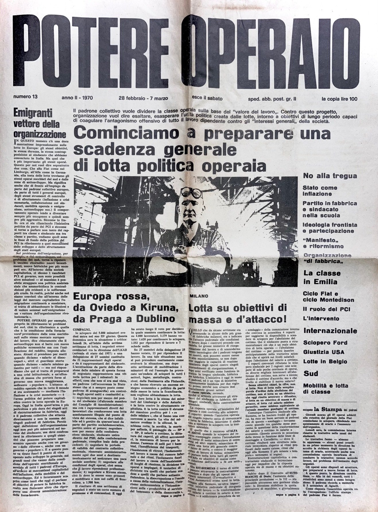 Potere operaio. N. 13 Anno II 1970. 28 Febbraio – 7 Marzo. Esce il sabato. COMINICIAMO A PREPARARE UNA SCADENZA GENERALE DI LOTTA POLITICA OPERAIA
