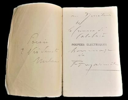 In 8° grande; 192, (4) pp. Brossura editoriale con piccoli strapetti al margine esterno senza perdita di carta e per il resto esemplare in buone-ottime condizioni di conservazione. Bella dedica autografa di Marinetti da Luigi Caputo, fondatore e direttore per più di 40 anni di una delle testate giornalistiche più importanti del meridione, la Cronaca di Calabria e altra nota manoscritta al recto del piatto anteriore, sempre dello stesso Marinetti Poesia, Via del Senato, Milano. Prima edizione di questo scritto teatrale del celebre drammaturgo, poeta e scrittore, fondatore del movimento futurista, Filippo Tommaso Marinetti (Alessandria d'Egitto, 22 dicembre 1876 Bellagio, 2 dicembre 1944).Lopera porta al piatto anteriore la denominazione di Deuxieme edition ma come ben sottolineato da numerosi studiosi, i futuristi e Marinetti per primo, erano soliti indicare le edizioni in modo del tutto fittizio ed è unanimemente accettato che tutte le edizioni del 1909 sono, in realtà, prime edizioni e che la denominazione, Deuxieme edition sia del tutto fittizia. Lopera contiene, tradotta in francese, la versione integrale del manifesto futurista con una menzione della prossima uscita del manifesto sul Figarò oltre ad una «interview sur le Futurisme» allautore già apparsa su 'Comoedia' il 26 marzo 1909. Lopera teatrale Poupees electriques venne rappresentata per la prima volta in italiano, in Italia a Torino, al Teatro Alfieri il 15 gennaio del 1909 con il titolo La donna è mobile e non riscuotendo particolare successo. Pubblicata in francese, questa è la prima edizione assoluta, in quanto unedizione italiana, non venne pubblicata prima del 1920. Lopera è considerata una degli scritti sperimentali e di passaggio della poetica marinettiana. In esso lautore alterna stilemi tipici del teatro tradizionale borghese come ad esempio, il tema dellintreccio amoroso di sue coppie, a strutture ed idee del teatro davanguardia. Rif. Bibl.: Salaris, Bibliografia, p. 45; Mughini, 389; Cammarota, Marinetti, 18.