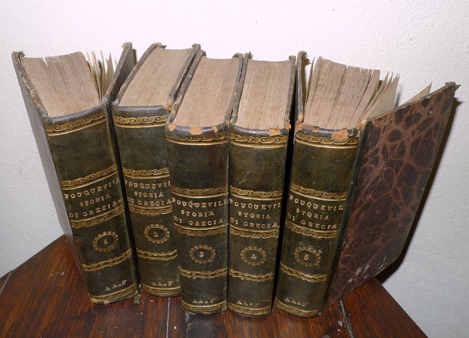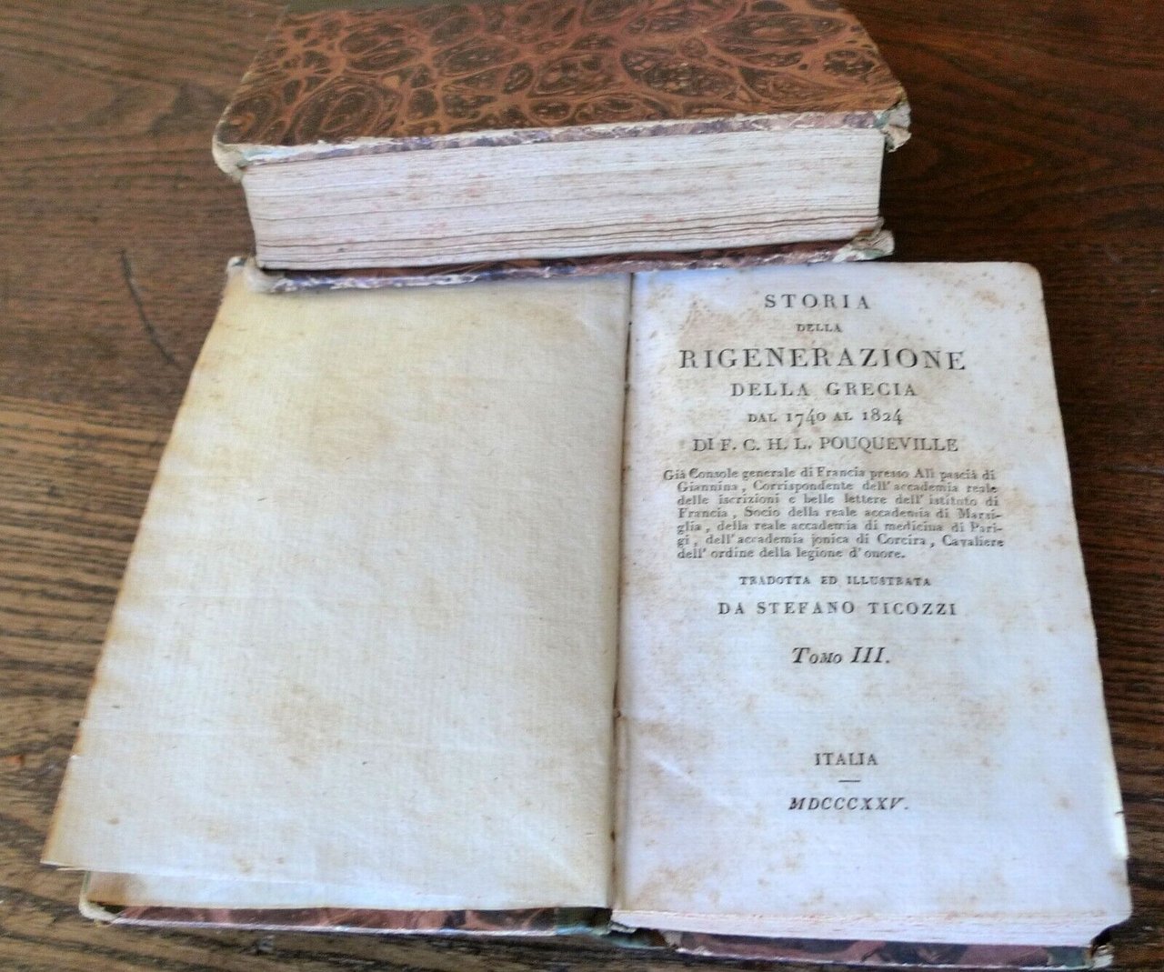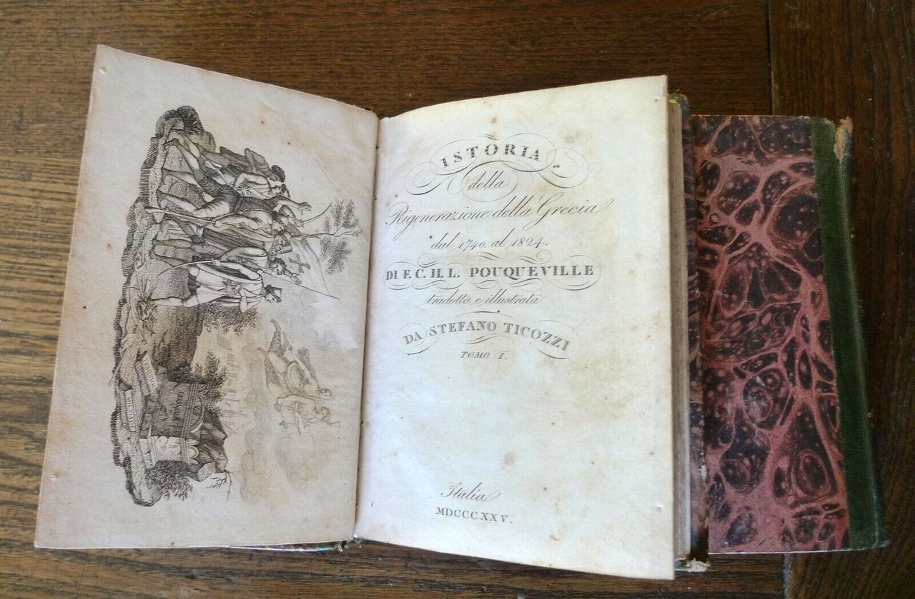 ISTORIA DELLA RIGENERAZIONE DELLA GRECIADAL 1740 AL 1824DI F.C.H.L. POUQUEVILLE,TRADOTTA E ILLUSTRATA DA STEFANO TICOZZI.TOMI I-X.[10 TOMI RILEGATI IN 5 VOLUMI, OPERA COMPLETA].ITALIA MDCCCXXV-MDCCCXXVI (1825-1826),senza informazioni editoriali,copertina rigida, rilegatura coeva in mezza pelle,14x9 cm., pp.229; 255; 220; 222; 226; 227; 249; 191; 234; 211,tagli a spruzzo,con una illustrazione all'antiporta del tomo I,peso: kg.1,2