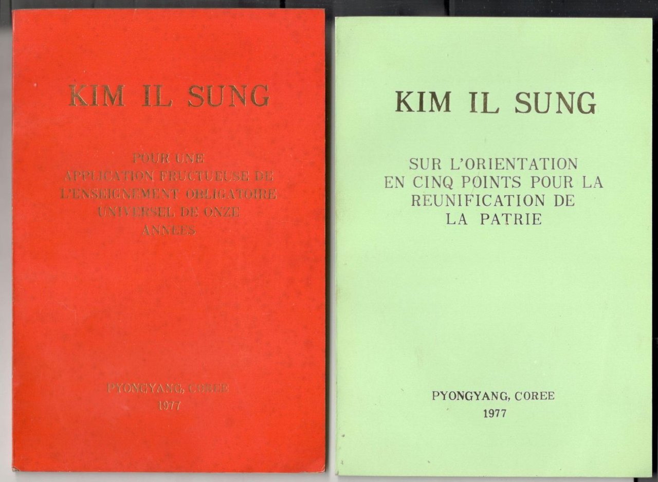 Due placchette in 16°, pp. 20; 12. Brossura editoriale con titoli oro. Leggeri segni del tempo. Copie in buono stato. Insieme di due discorsi del Presidente della Corea Kim il Sung.