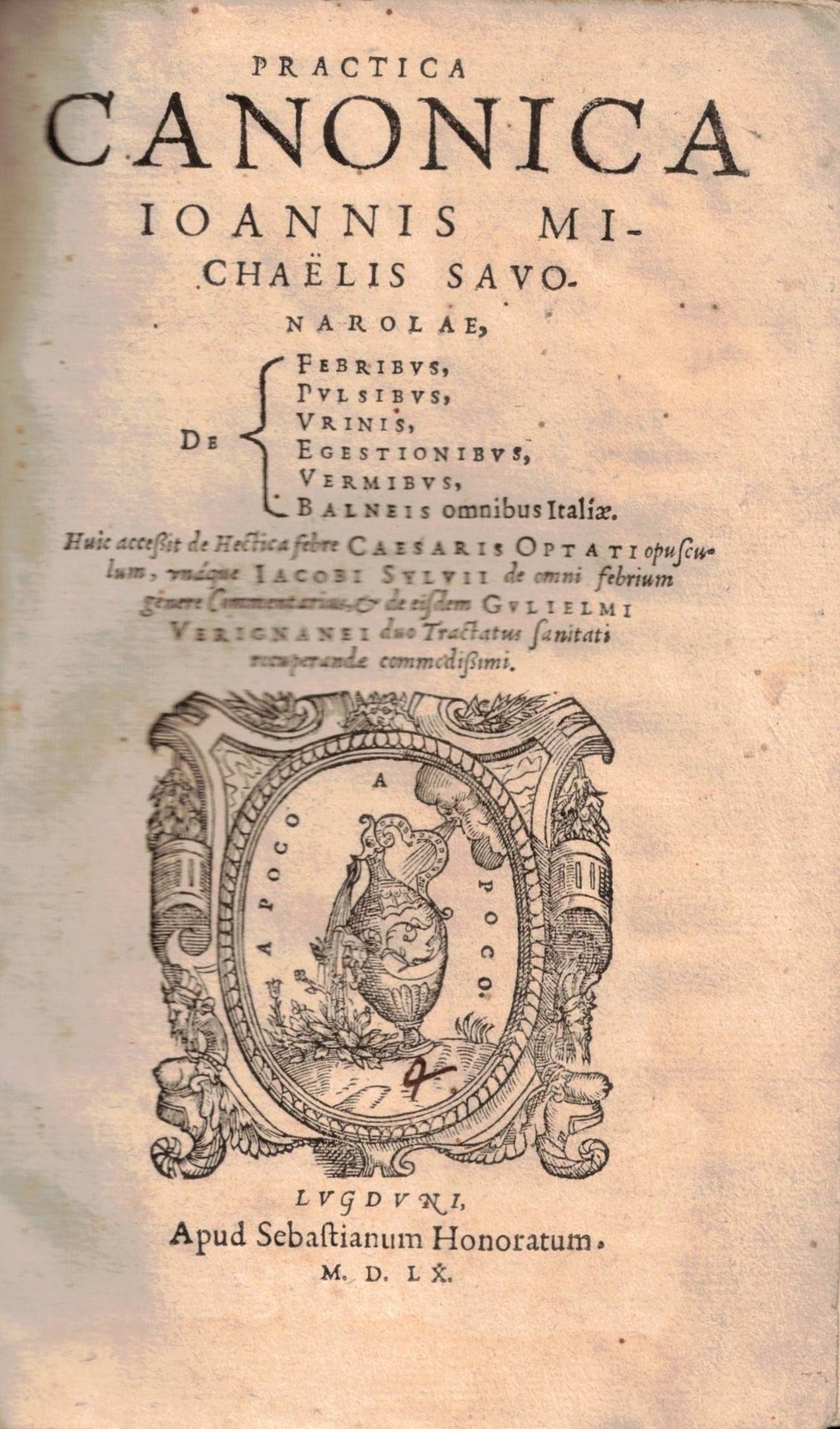 In-16 p. (mm. 165x100), piena pergamena coeva, titolo manoscritto al dorso, 8 cc.nn., 1119 pp., marca tipografica al frontespizio. Bella edizione che raccoglie una collezione di opere di Giovanni Michele Savonarola: De pulsibus - De urinis - De egestionibus - De vermibus - De balneis omnibus Italiae.Savonarola, professore di medicina presso l'Università di Pavia, fu medico di corte presso la corte Estense. Cfr. Wellcome Library,I,5789.Nel nostro esemplare le pp. 369-736 sono posposte dopo la 1119; cc. uniformemente e lievemente arrossate, altrimenti ben conservato.