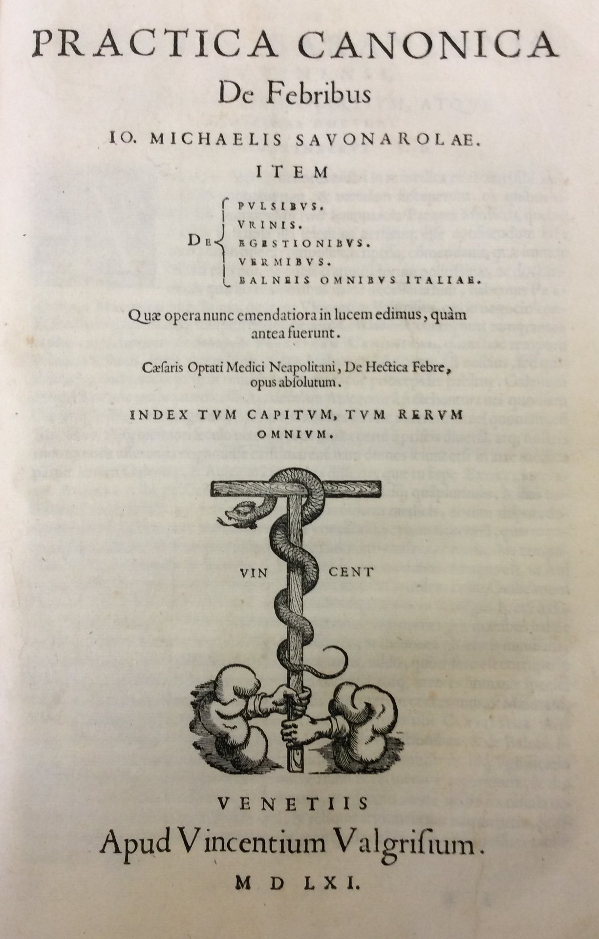 PRACTICA CANONICA DE FEBRIBUS. - Quae opera nunc emendatiora in lucem edimus, quam antea fuerunt. Caesaris Optati medici neapolitani, De hectica febre, opus absolutum. Index tum capitum, tum rerum omnium.