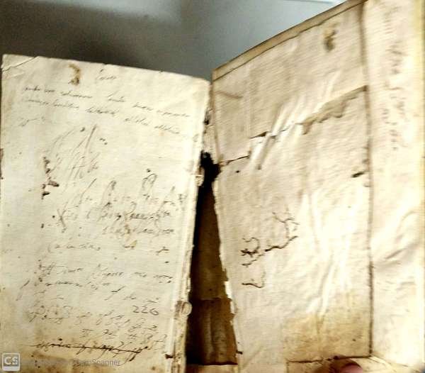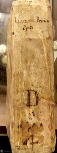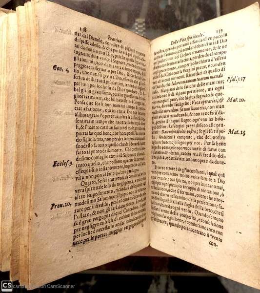 In 16°, p. perg. molle, cc.nn. 8 + pp. 676. Capilettera. L'opera è dotata di 15 inc. (cm. 3,5 x 5 circa) poste come testate all'inizio di ogni Mistero. Fioriture. Alcune pp. brunite. Tracce di gore che, tuttavia, non ledono il t. Rifilato al marg. sup. Mende al front. (anche piccolo foro e appunti manoscritti). Copp. semi sciolte. Mende alle copp. Antichi forellini che interessano poche lettere.