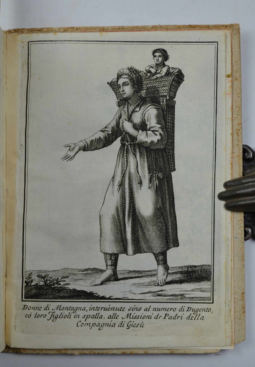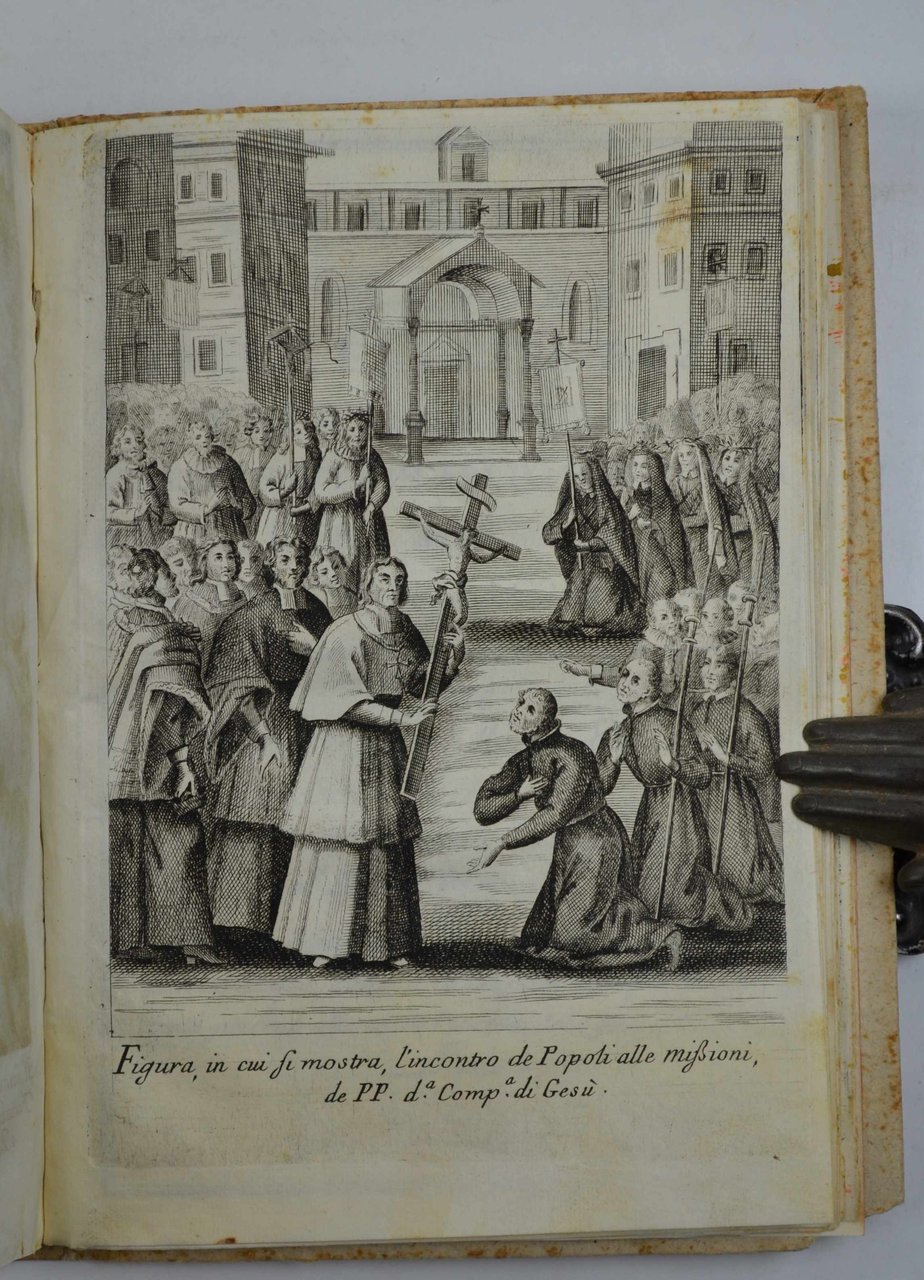 Due parti in un volume di cm. 21,5, pp. (16) 118 (2); 99 (1). Grande vignetta con stemma gesuitico in rosso ad entrambi i frontespizi, capolettera, testate, partiture di musica notata per litanie e salmi e 26 belle tavole f.t. incise in rame. Legatura coeva in cart. alla rustica con nervi passanti e titoli ms. al dorso. Esemplare genuino, pulito ed in eccellente stato di conservazione. La seconda parte titola: Imagini di persone della Elvezia, Rezia, Valesia e Tirolo intervenute in abito di penitenza nelle missioni... Si tratta della edizione originale di quest'opera più volte ristampata in formato minore nel corso del '700. Estremamente raro e come precisa Piantanida (4871): "...non registrata nelle principali bibliografie".