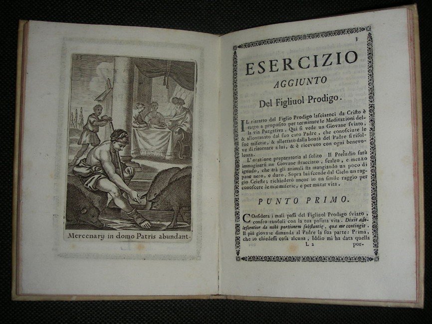 in-4 antico, pp. 8, 8, 7, 4, 8, 8, 8, 8, 8, 8, 8, 8, 7, 8, 8, 8, bella leg. p. perg. coeva con tit. mss al d. Tagli colorati. Vignetta in legno al front. con lo stemma dei Gesuiti. Con 16 tavv. inc. in rame (una per ogni esercizio). Testo incorniciato da fine fregio xilogr. Ex libris. Belliss. esempl. a larghi margini. [069]
