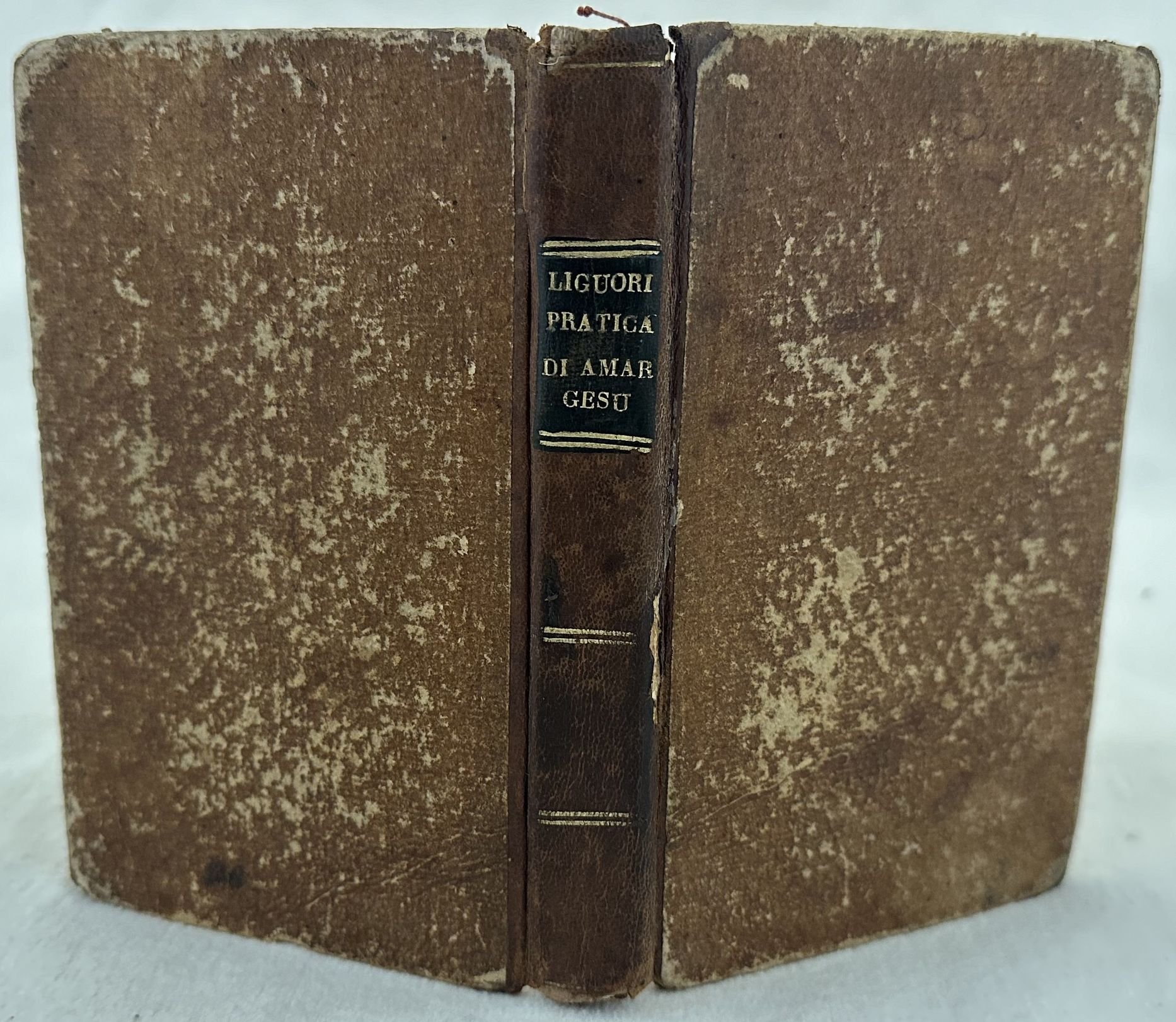 Edizione del 1831 di questa opera di Alfonso De Liguori sul modo di amare Gesù Cristo. L'opera è in un volume ed è completa. Alla fine Ristretto delle virtù dichiarate nell'opera che dee praticare chi ama Gesù Cristo. In buone condizioni. Copertina in mezza pelle con titolo e decorazioni in oro al dorso in buone condizioni generali con lievi usure ai margini e dorso. Legatura in buone condizioni. Pagine in buone condizioni con fioriture. In 16. cm 16x10. Pp. 267+(1). Edition of 1831 of this work of Alfonso De Liguori about the way to love Jesus Christ. The work is in one volume and it is complete. At the end Ristretto delle virtù dichiarate nell'opera che dee praticare chi ama Gesù Cristo. In good conditions. Half leather coeval cover with gilted title and decorations in the spine in good conditions lightly worn in the extremities. Binding in good conditions. Pages in good conditions with foxing. In 16. cm 16x10. Pp. 267+(1).
