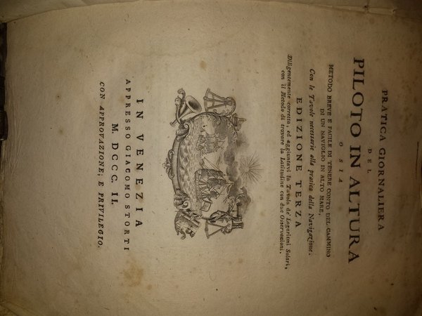 Pratica giornaliera del piloto in altura o sia metodo breve e facile di tenere conto del cammino di un naviglio in alto mare, con le tavole necessarie alla pratica della navigazione. Edizione terza. Filigentemente corretta, ed aggiuntavi la Tavola de' Logaritmi Solari, con il Metodo di trovare la Latitudine con due Osservazioni.