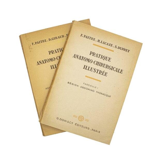 Autori: Paitre - Lacaze - Dupret Titolo: Pratique Anatono-Chirurgicale Illustrée - 2 Vol Sottotitolo: Fascicule I : Région - Abdomino - Thoracique; Fascicule II: Région - Abdominale - Moyenne et rectum Edizione: G. Doin &C. Èditeurs - Paris 1934 Dimensioni: 18 x 27 cm c.a. ( 1X) Pagine: Vol 1: 404; Vol 2: 450 Copertina: Brossura Condizioni: Buone come da foto