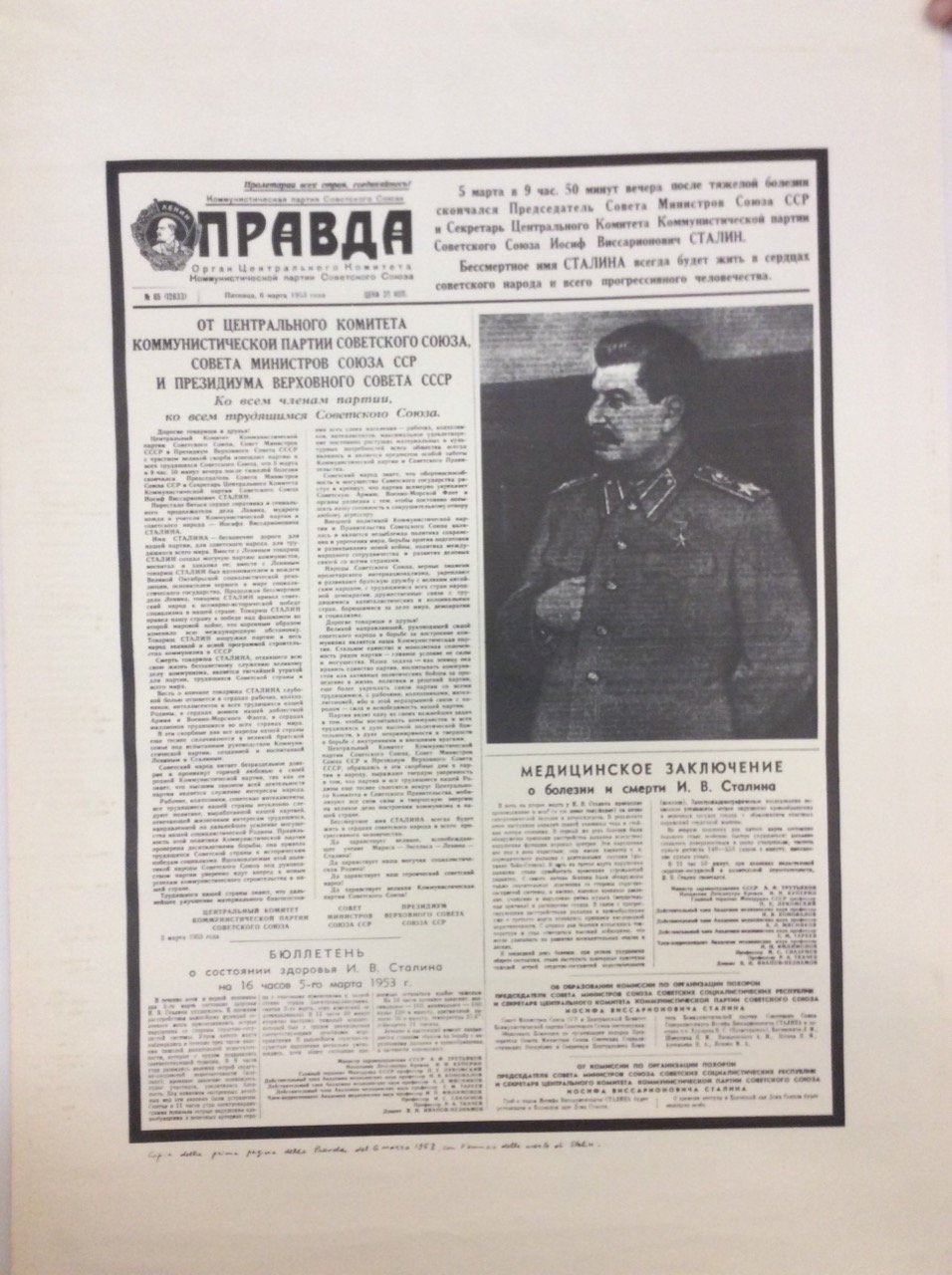 In folio (cm 72 x 50,5). Copia della prima pagina del quotidiano "Pravda" del 6 marzo 1953, con l'annuncio della morte del dittatore sovietico Stalin.Dal Comitato Centrale del Partito Comunista dell'Unione Sovietica, dal Consiglio dei Ministri dell'URSS e dal Presidium del Soviet Supremo dell'URSS a tutti i membri del Partito, a tutti i lavoratori dell'Unione Sovietica. Il 5 marzo, alle ore 9.50, è morto dopo una lunga malattia Joseph Vissarionovich Stalin, Presidente del Consiglio dei Ministri dell'URSS e Segretario del Comitato Centrale del Partito Comunista dell'Unione Sovietica. Il nome immortale di Stalin vivrà sempre nei cuori del popolo sovietico e di tutta l'umanità progressista. Ben conservato. , , . 5 9 50 . . / Ot Central'nogo Komiteta Kommunisti eskoj partii Sovetskogo Sojuza, Soveta Ministrov Sojuza SSR i Prezidiuma Verchovnogo Soveta SSSR ko vsem lenam partii, ko vsem trudja imsja Sovetskogo Sojuza / 5 marta v 9 asov 50 minut ve era posle tjaeloj bolezni skon alsja Predsedatel' Soveta Ministrov Sojuza SSR i Sekretar' Central'nogo Komiteta Kommunisti eskoj partii Sovetskogo Sojuza Iosif Vissarionovi Stalin. Bessmertnoe imja Stalina vsegda budet it' v serdcach sovetskogo naroda i vsego progressivnogo elove estva..