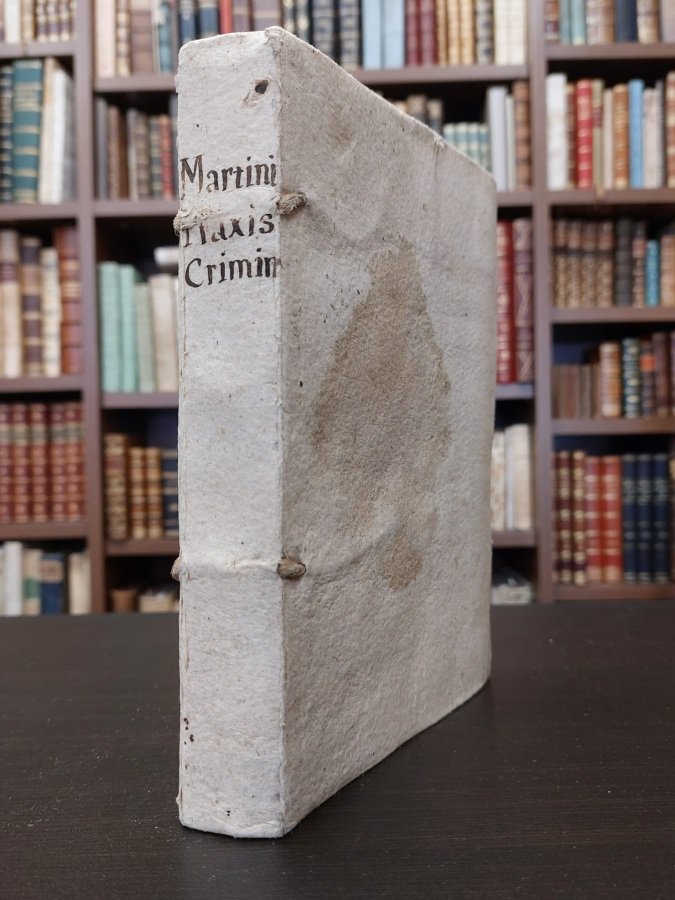 In-8° (cm. 20,3), legatura coeva in cartonato alla rustica con titolo anticamente manoscritto al dorso (gora al piatto anteriore); pp. [4] 396 in barbe, in buono stato (lievi e sporadiche fioriture, accentuate ad occhietto e frontespizio); antica firma di appartenenza alla controguardia. Seconda edizione, non comune, sistemata in modo più elegante, epurata dagli errori, ed aumentata di argomenti ritenuti molto necessari in materia criminale. Esemplare molto buono. (NH5)