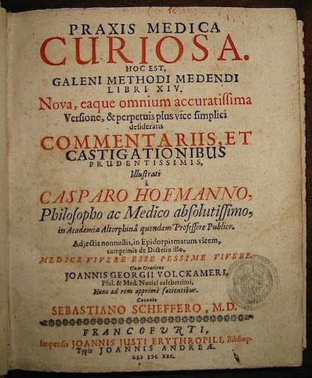 Praxis medica curiosa. Hoc est Galeni methodi medendi libri XIV. Nova, eaque omnium accuratissima versione, & perpetuis plus vice simplici desideratis Commentariis, et castigationibus prudentissimis illustrati.