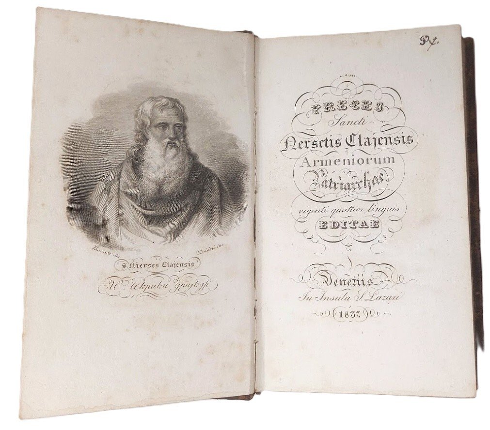 >in-8 piccolo (175x93 mm), pp. (6), 434, bella legatura coeva in pelle, cornice floreale ai piatti, raffinati motivi geometrici e floreali al dorso, il tutto impresso in oro, tagli dorati. Completo del ritratto in antiporta di S. Nersete. Il testo comprende 24 preghiere al santo stampate in 24 lingue diverse, fra cui l'etiopico, l'armeno, l'ebraico, il gaelico, il russo, il cinese, lo svedese, il turco, il siriaco, con l'uso dei propri caratteri tipografici. Il monastero armeno fu votato a San Lazzaro nel 1717 da una congregazione di monaci seguaci di Mechitar. Bell' esemplare di questo graziosissimo saggio tipografico stampato nel monastero armeno sull'isola di san Lazzaro nella laguna di Venezia, ex-libris del Conte Paolo Vimercati-Sozzi, Cavaliere dell'Ordine dei SS. Maurizio e Lazaro.