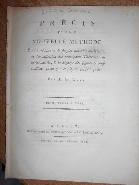 PRECIS D' UNE NOUVELLE METHODE POUR REDUIRE A' DES SMPLES PROCEDES ANALYLITIQUES, LA DEMOSTRATION DES PRINCIPAUX. PARIS, IMPRIMERIE DU JOURNAL DE PARIS, AN VI° 1798 1798