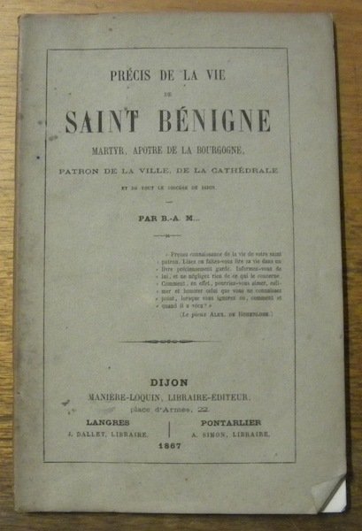 Précis de la Vie de Saint Bénigne. Martyr, apôtre de la Bourgogne, patron de la ville, de la cathédrale et de tout le diocèse de Dijon.