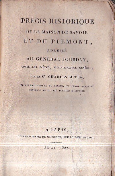 In-8° (215x135mm), pp. (4), 127, brossura originale rosa. Una firma ottocentesca. Bell'esemplare in barbe. Edizione originale. Nella sua prima opera storica, il Botta, all'epoca membro del Consiglio d'Amministrazione del Piemonte come 27 divisione militare, delinea in modo chiaro ed efficace la storia e le condizioni del Piemonte durante l'Ancien Regime, evidenziando le commencemens et le progres de la domination des ducs de Savoie dans les differentes contrees du Piemont, et les vicissitudes que ce pays a subies depuis la revolution. Manno-Promis, I, 1045; Pavesio, C.B. e le sue opere storiche, p.157; Giuseppe Talamo in D.B.I., XIII, 1971, p. 367.