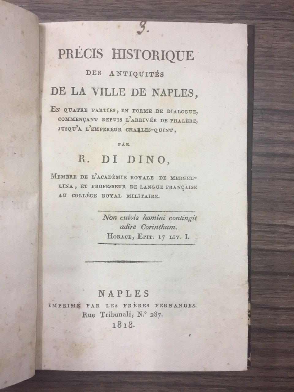 En quatre parties, en forme de dialogue commençant depuis l'arrivée de phalère, jusqu'a l'empereur Charles-quint. Naples.Imprime par Les Frères Fernandes 1818, 16°, pp. 132. Leg. Mz tela, tit. in oro al dorso. Segni del tempo.