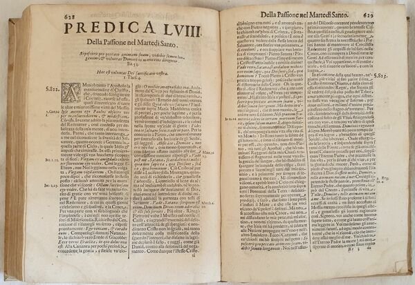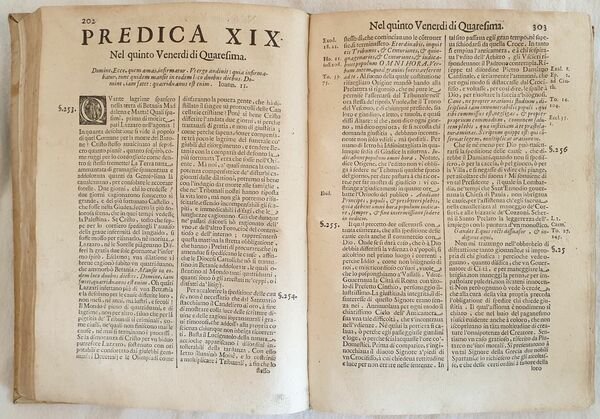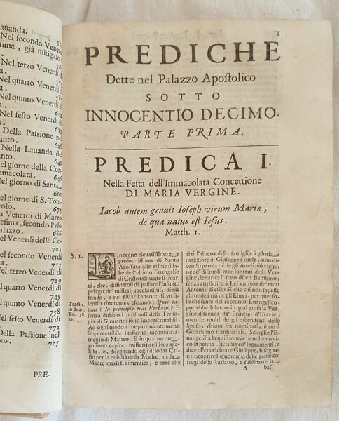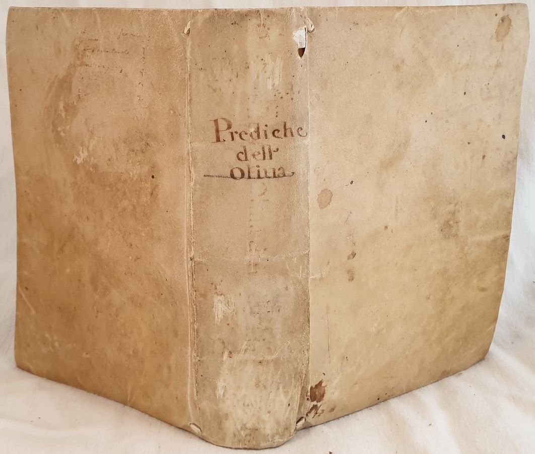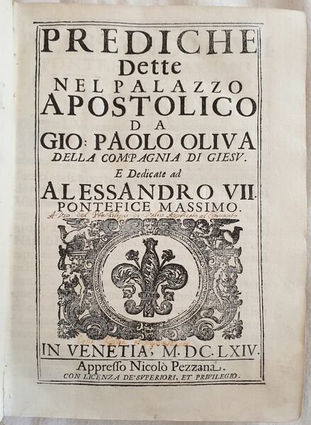Bella edizione del 1664 di questa raccolta di prediche dette nel palazzo apostolico dal gesuita Giovanni Paolo Oliva (1600-1681) ed apprezzato oratore. Oliva fu preposto generale dell'Ordine dal 31 luglio 1664. Già vicario generale della Compagnia dal 1661, il suo generalato fu turbato dalla polemica sul quietismo, dalla questione dei riti cinesi, dall'accusa di lassismo lanciata contro l'ordine e dal fatto che in Francia numerosi gesuiti sostenevano le prerogative reali contro le rivendicazioni papali e difendevano i privilegi galligani del clero (Cfr. Wikipedia). All'interno è presente qualche piccola incisione ad inizio predica. A fine predica 52 si legge "L'avvento dell'anno 1656 di tralascio per la Peste". Tra gli argomenti trattati: Cadaveri, Arca di Dio, Cressino, San Crespino, Datan e Abiron, Fontane pubbliche, Girolamo da Narni, Eretici, Isaac Abate, Lago di Nemi, Madriperle, Naaman, Nilo, Oliveto, San Paolino, Satana, Simon Mago, San Tommaso d'Acquino, Cardinale Ugone ecc. Antiche firme al frontespizio. Bella legatura in piena pergamena coeva con titolo manoscritto al dorso. In buone condizioni e completo. Copertina in piena pergamena coeva in ottime condizioni generali con lievi usure ai margini e dorso. Legatura in buone condizioni. All'interno le pagine si presentano in ottime condizioni con rare fioriture. Prima carta bianca strappata a metà. In 8. Dim. 23x17 cm. Pp. (24)+800+(52).Beautiful edition of 1664 of this collection of preeches told in palazzo apostolico by the jesuit Giovanni Paolo Oliva (1600-1681) and appreciated orator. Insdie there is some little engraving in the beginning of each preech. At the end of preech 52 there is the writing "L'avvento dell'anno 1656 di tralascio per la Peste". Between the issues treated: dead bodies, Arch of God, Cressino, San Crespino, Datan e Abiron, Fontane pubbliche, Girolamo da Narni, Eretici, Isaac Abate, Lago di Nemi, Madriperle, Naaman, Nilo, Oliveto, San Paolino, Satana, Simon Mago, San Tommaso d'Acquino, Cardinale Ugone ecc. Antique signature in the title page. Beautiful full parchment coeval with handwritten title in the spine. In good conditions and complete. Full parchment coeval cover in very good general conditions slightly worn in the edges and spine. Binding in good conditions. Pages in very good condiitons with occasional foxings. First blank page teared into two parts. In 8. Dim. 23x17 cm. Pp. (24)+800+(52).
