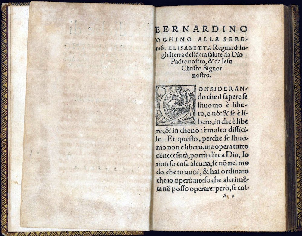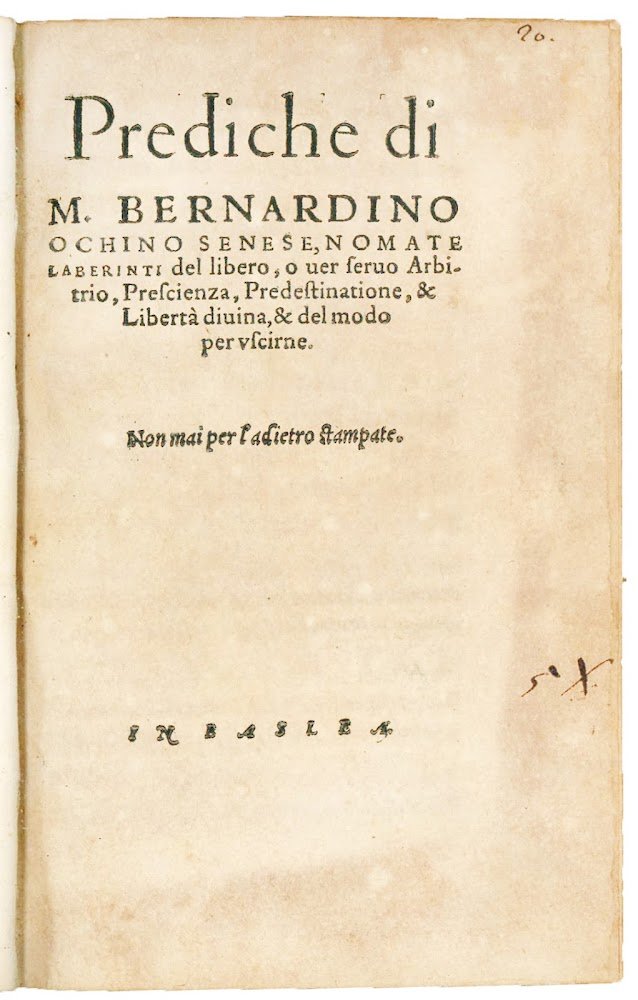 First edition, dedicated by the author to Elisabeth I Queen of England, of one of Ochino's most important works published during his years in Zurich, that immediately stirred a polemical reaction from the most intransigent Calvinists such as Théodore de Bèze, who in Ochino's autonomy of thought and individualism felt a threat to the Reformed orthodoxy. In the Prediche nomate Labertinti, discussing the delicate issue of free will, Ochino criticizes both those who held that men act freely and those who held the opposite, and concluded that the only way out of this existential conundrum could be by accepting the Socratic precept “unum scio quod nihil scio” and by preferring the rational analysis to dogmatism. This position inevitably ended up clashing with the increasing confessional hardening of the Zurich religious orthodoxy.