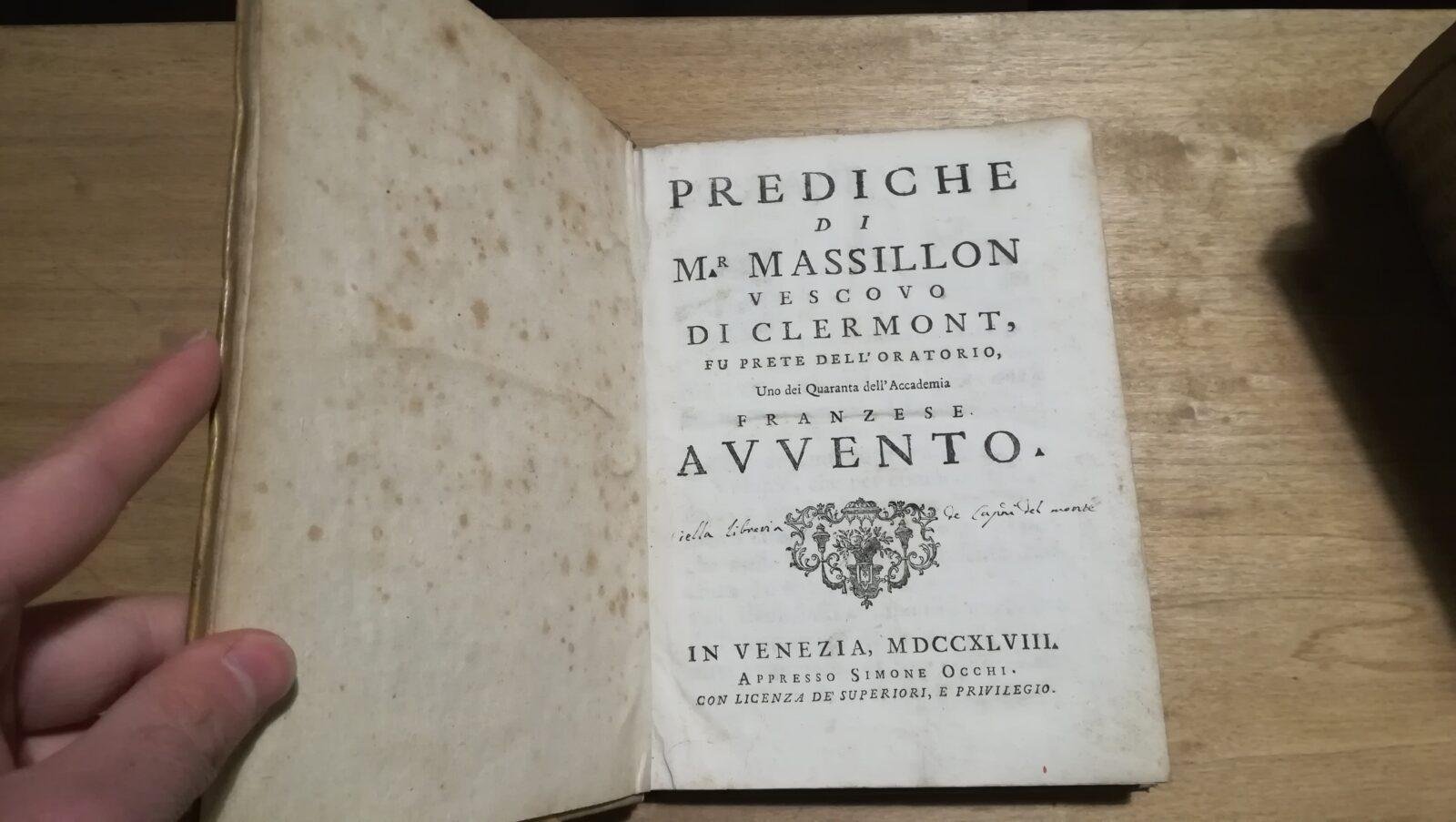 Prediche di Massilloon Vescovo di Clermont - Simone Occhi - 1748 Libro in buone condizioni, leggere abrasioni al dorso della copertina, leggere fioriture sparse. Non esitate a contattarci per altre foto o richieste. Saremo lieti di soddisfare ogni vostra esigenza.