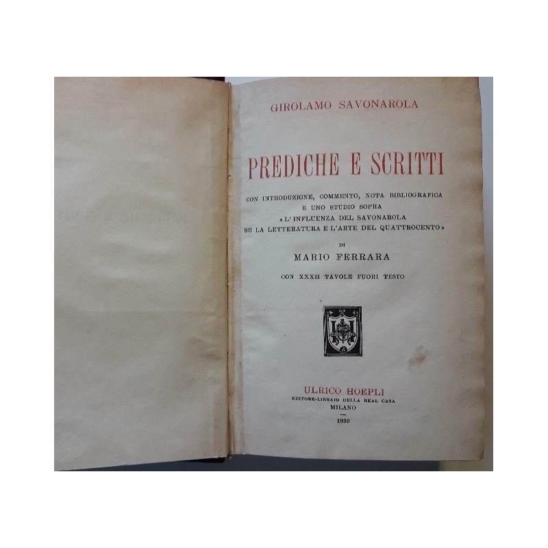 In 8', leg. amatoriale, con tit. in oro al dorso, sguardie a motivi geometrici, , pp. XI, 426, con introduzione, commento, nota bibliografica e uno studio sopra "l'influenza del Savonarola su la letteratura e l'Arte del Quattrocento di Mario Ferrara con XXXII tav. in n. f.t.; volume in buono stato, abrasione al dorso,timbro numerico all'occhiello, ordinari segni del tempo.Luogo di pubblicazione MilanoEditore HoepliAnno pubblicazione 1930Materia/Argomento Arte, Letteratura, Filosofia ***Due to bureaucratic reasons, books dated over 70 years old cannot be immediately exported, please contact us before placing the order.***