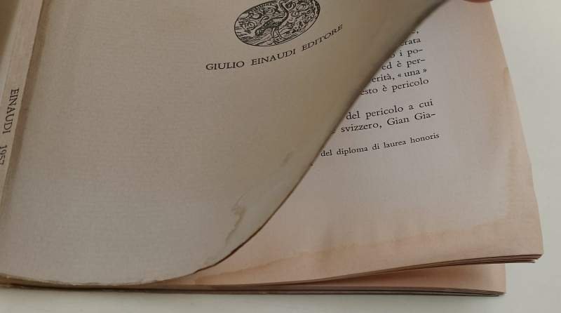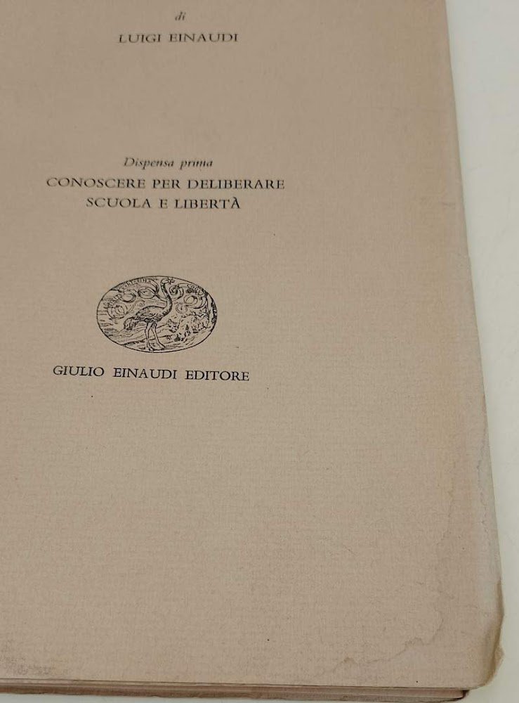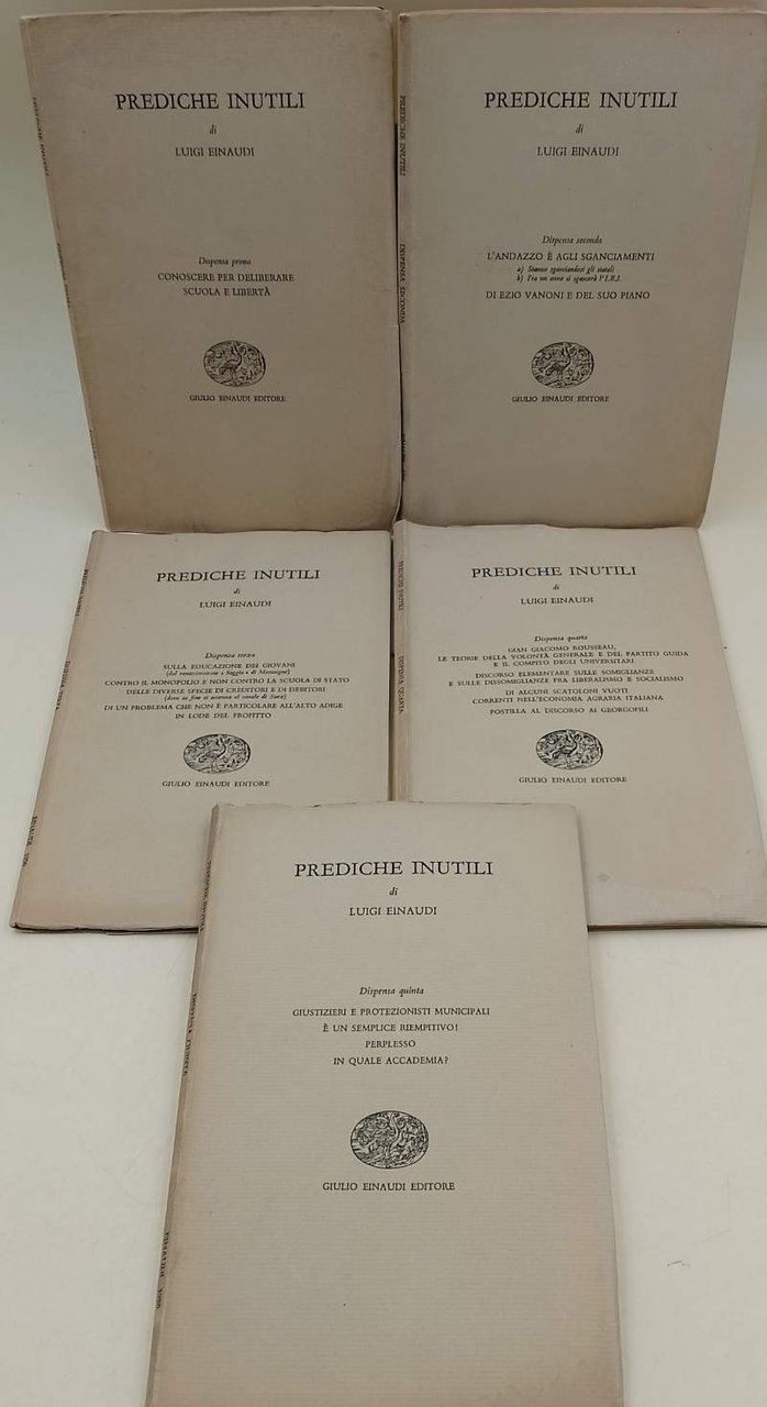 5 voll. in 8', br. ed., pp. 333 a numerazione progressiva; 1- Conoscre per deliberare scuola e liberta' 2- l'andazzo e' agli sganciamenti-a) stanno sganciando gli statali- b) fra un anno si sgancera' l'I.R.I.- di Ezio Vanoni e del suo piano. 3- sulla educazione dei giovani-contro il monopolio e non contro la scuola di stato-delle diverse specie di creditori e di debitori- di un problema che non e' particolare all'Alto Adige in lode del profitto. 4- Gian Giacomo Russeau, le teorie della volonta' generale e del Partito guida e il compito degli universitari- discorso elementare sulle somiglianze e sulle dissomiglianze fra liberalismo e socialismo- di alcuni scatoloni vuoti correnti nell'economia agraria italiana- postilla al discorso ai gergofili. 5-giustizieri e protezionisti municipali-e' un semplice riempitivo- perplesso- in quale accademia. Tracce di umidita' ai margini inferiori dei voll. 1 e 4 (foto), altrimenti in buono stato0, ordinari segni del tempo ***Due to bureaucratic reasons, books dated over 70 years old cannot be immediately exported, please contact us before placing the order.***
