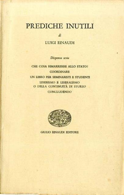 P. 335-415 ; 22 x 14 cm. Apparse in dispense a partire dal 1955, queste attualissime «Prediche inutili» furono riunite in volume nel 1959. L’Italia si illudeva allora di vivere in pieno «miracolo» economico, ma Einaudi, conscio della fragilità del fenomeno, cercava di individuare le cause profonde della mancanza di solidità dei progressi compiuti e di indicare gli opportuni rimedi. Einaudi non si stancava di insistere sulle norme del buon governo, dall’economia alla scuola, alla pubblica amministrazione, alla legislazione sociale e al finanziamento dei partiti. Amava ripetere che per deliberare occorre conoscere la realtà nella quale si opera attraverso studi non viziati da tendenziosità o schemi preconcetti. La concretezza e la lucidità dell’analisi si traducono nella classica nitidezza delle pagine. Qui, come nelle altre sue opere, Luigi Einaudi è ammirevole per il rigore scientifico, l’apertura mentale, e l’esemplare chiarezza dell’esposizione, accessibile a tutti i lettori. Brossura editoriale, coperta in cartoncino flessibile con alette. Codice libreria 9032.