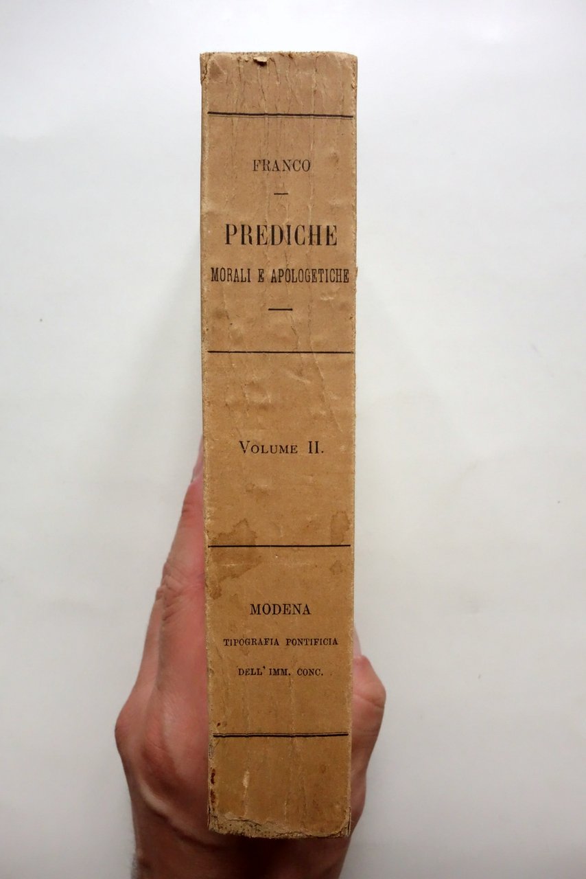 Padre Secondo Franco, Prediche morali e apologetiche volume II Tip. Pontificia ed Arcivescovile dell'Imm. Concezione, Modena 1886; cm 19,5x12; pp. 602; brossura ed. All'antiporta timbro di biblioteca, esemplare regolarmente annullato. Condizioni di conservazione Buone condizioni con tracce d'uso e del tempo, lievemente ingiallito ai margini della brossura e delle pagine (ingiallimento dovuto al tipo di carta). Alcune leggere bruniture. SETT127.L24411 N