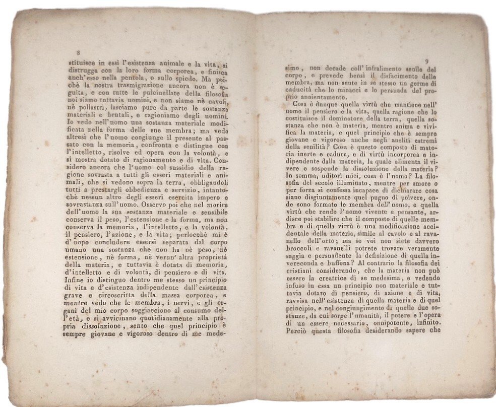 >in-8, pp. 30, (2 bianche), broch. (privo delle copertine). Prima edizione di quest'opuscolo che il Piergili ritiene stampato a Pesaro e Modena (cfr. Notizia della vita e degli scritti del conte Monaldo Leopardi, a cura di Gius. Piergili, Appendice, p. 72). Contiene: ''Predica prima su i novissimi. L'esordio, la morte, il giudizio, inferno, la raccomandazione della elemosina, il paradiso''. In fine, il numero «1150» rappresenta la firma dell'autore, poiché in numeri romani: MCL rappresenta le iniziali di Monaldo Conte Leopardi. Di grande rarità. Discreto esemplare, a pieni margini e in barbe, ma con fioriture della carta. Parenti, Rarità, II, p. 159-160. Notizia della vita e degli scritti del conte Monaldo Leopardi, a cura di Gius. Piergili, Appendice, p. 72