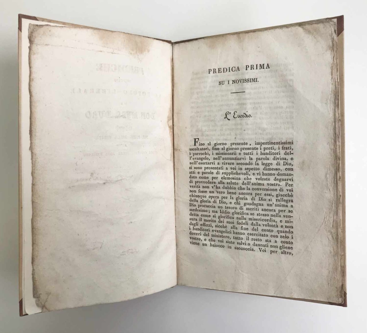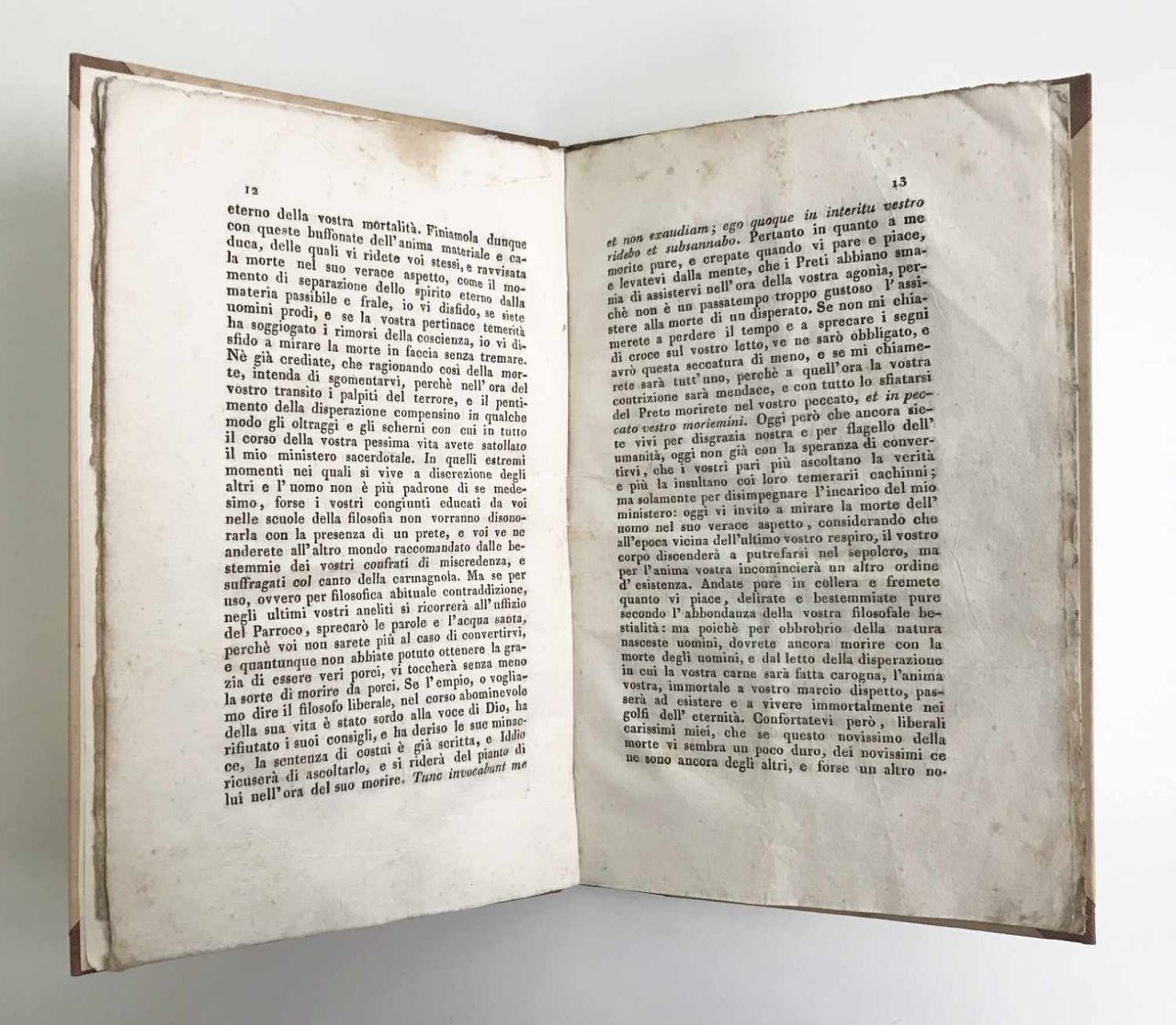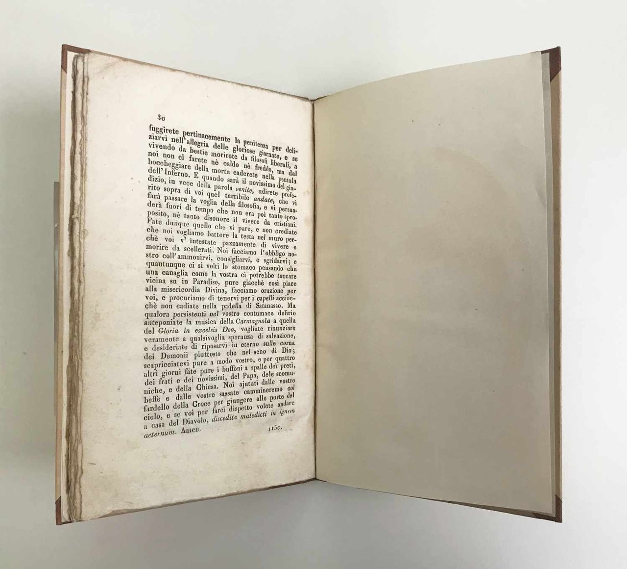 LIBROContraffazione sconosciuta al Parenti e alle bibliografie.Più che buon esemplare in barbe, mm 210 x 135 (lievi fioriture al taglio alto).Violenta e brillante invettiva diretta contro i princìpi del liberalismo nascente. Compare in fine la firma dell’autore: «1150» che in numeri romani diventa MCL, Monaldo Conte Leopardi. Aperto da un «Esordio», il testo è suddiviso in sezioni intitolate «La morte» (pagina 6), «Il giudizio» (pagina 14), «L’inferno» (pagina 18), «La raccomandazione delle elemosina» (pagina 24) e «Il paradiso» (pagina 26).Parenti, Rarità, II, p. 159-160