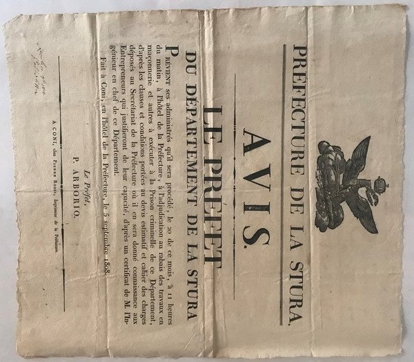 Prefecture de la Stura . Prvient ses administrs qu'il sera procd . A L'ADJUDICATION AU REBAIS DES TRAVAUX EN MACONNERIE ET AUTRES A' EXECUTER A' LA PRISON CRIMINELLE DE CE DEPARTEMENT .