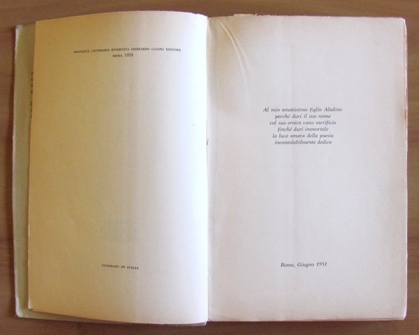 Collana Poeti d'Oggi 1. Editore Gherardo Casini - Roma, I edizione 1953. Brossura editoriale con piccole imperfezioni alle cuffie del dorso, peraltro Nuovo. 14,5x21,5; pp.260. Buonissimo stato. , Molto buono (Very Good)