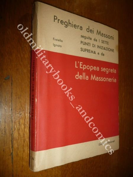 TITOLO: PREGHIERA DEI MASSONI SEGUITA DAI SETTE PUNTI DI INIZIAZIONE SUPREMA E DA L'EPOPEA SEGRETA DELLA MASSONERIA DESCRIZIONE: Edizioni Nazionali Roma 1961, br. ed. ca., pp. 119 in 16°. Edito in occasione del centenario dell'Unita' d'Italia. Raccoglie notizie storiche, Conciliazioni fallite e condanne papali, la religione della Massoneria, ecc. CONDIZIONI: Buone/Ottime manca la fascetta ed. PESO / WEIGHT: 150 gr. without package