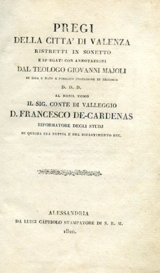 Pregi della Città di Valenza ristretti in sonetto e spiegati con annotazioni. Al nobil uomo il Sig. Conte di Valleggio D. Francesco De cardenas riformatore degli studj di questa sua patria e del dipartimento ecc.